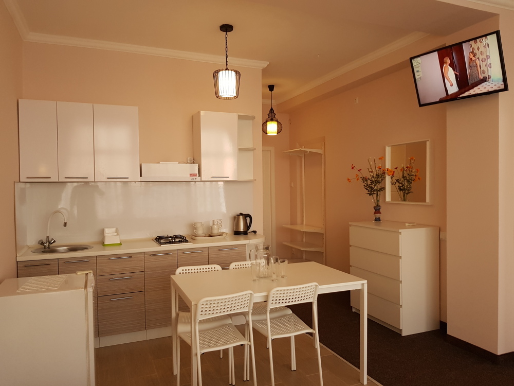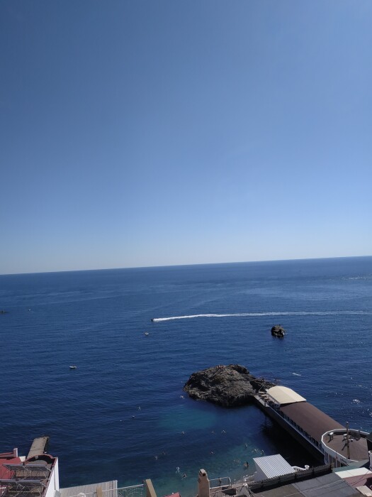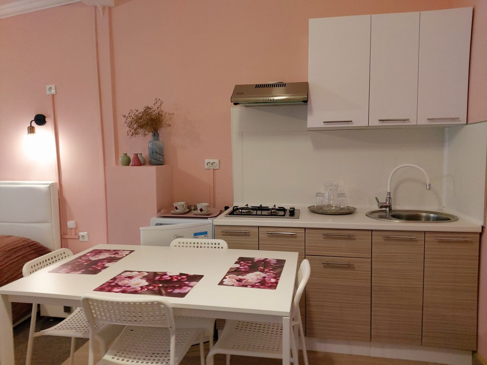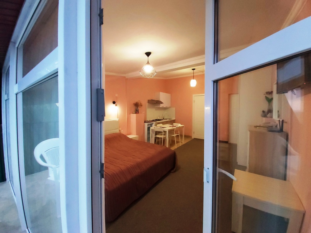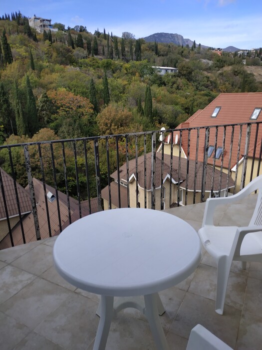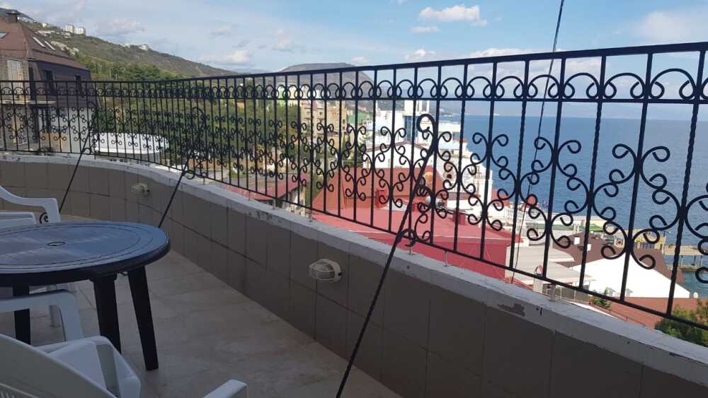 Терраса с прямым видом на море (стол и стулья), 4 спальных места, две комнаты (спальня и детская). Спальня двухспальная кровать, в детской комнате раскладной диван. Телевизор LCD, кондиционер, холодильник, электрочайник. Санузел (душевая кабина). Wi-Fi (интернет). Прямой вид на море видовая площадка. Фильтрованная вода бесплатно.