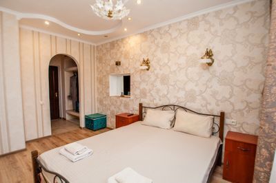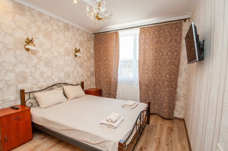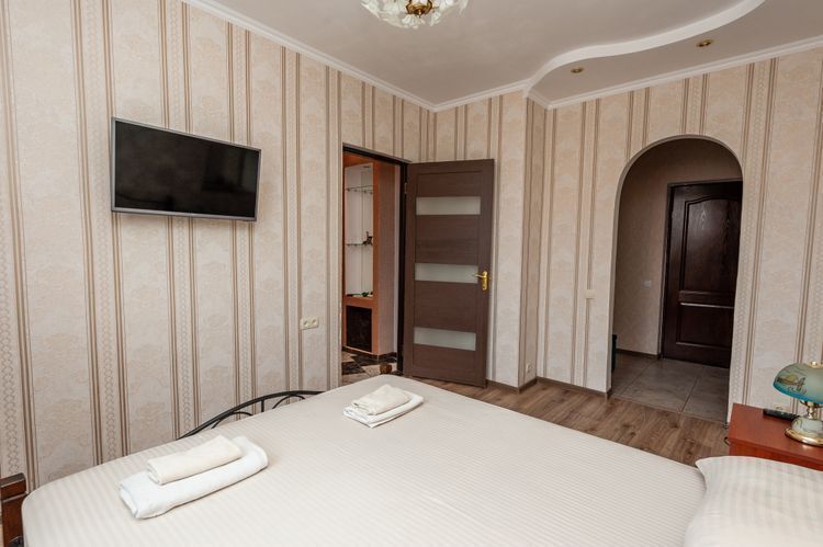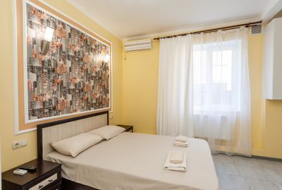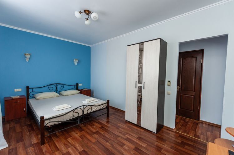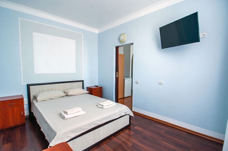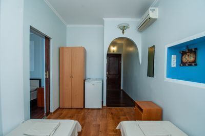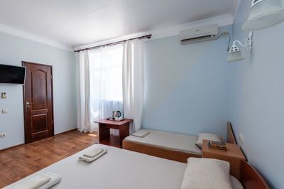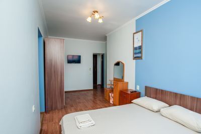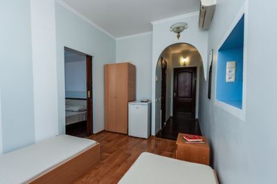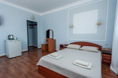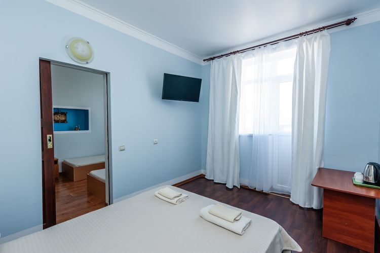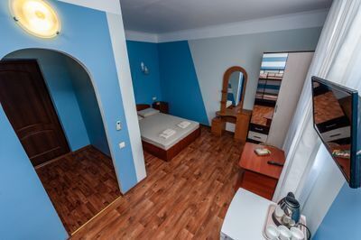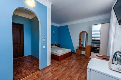 Просторный двухкомнатный номер с балконом и видом во внутренний двор. Идеально подойдёт для отдыха большой компанией или в кругу семьи. Номер имеет возможность размещения на дополнительном месте (в спальне 1 двуспальная кровать размером 160/200, в детской 2 односпальные кровати размером 80/200).