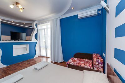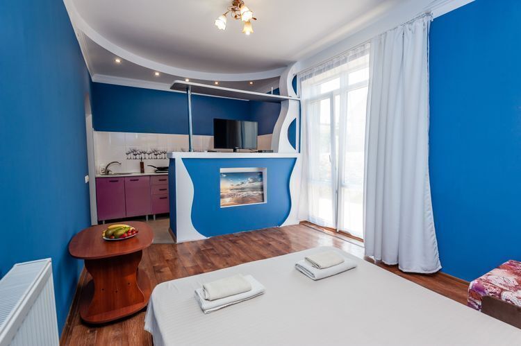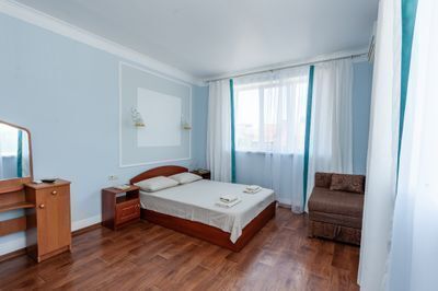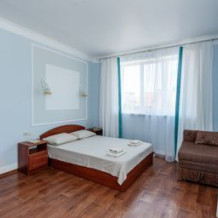 Номер повышенной комфортности большой площадью с отдельной кухней студией. Идеально подойдёт для отдыха большой компанией или в кругу семьи. Номер имеет возможность размещения на дополнительном месте (в спальне 1 двухкомнатная кровать 160/200, в гостиной двуспальный диван - кровать 130/180 и кресло - кровать 80/180).