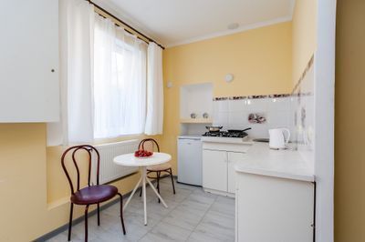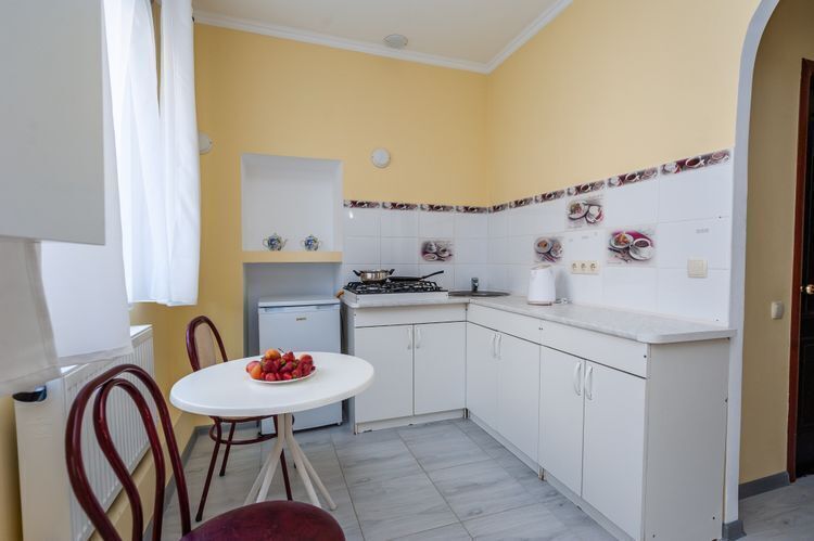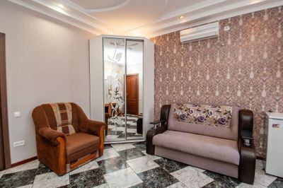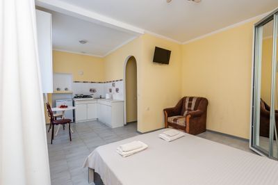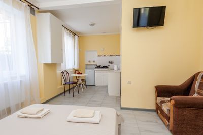 Красивые комфортные номера с кухней студией. Отлично подойдут для размещения 2-х человек либо семьи с ребенком (в номерах 1 двуспальная кровать размером 160/200 и кресло кровать размером 80/160). Все номера данной категории расположены на 1 этаже, площадью от 24 м2, имеют вид во внутренний двор гостевого дома.