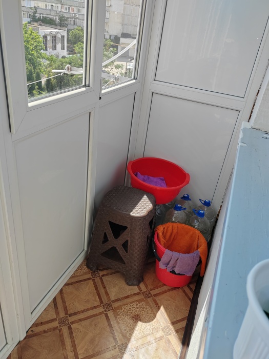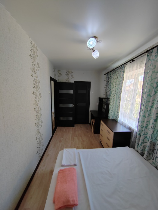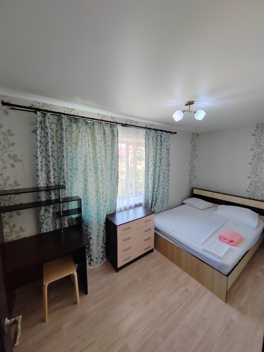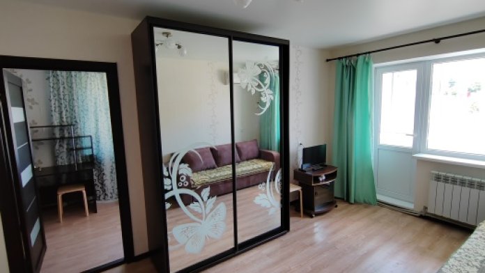 Первая комната с кондиционером, двумя диванами, шкаф, лоджия. Во второй комнате двуспальная кровать, тумба, окно, стол.