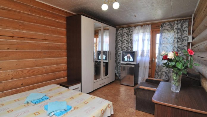 Бревенчатые корпуса со всеми удобствами в номерах. Собственная территория. Бесплатная автостоянка. 800 метров до городского и 950 метров до платного пляжа. Рядом расположены аквапарк и дельфинарий. Питание в кафе или в свободном формате по меню. Бассейн. Беседки. Мангал.