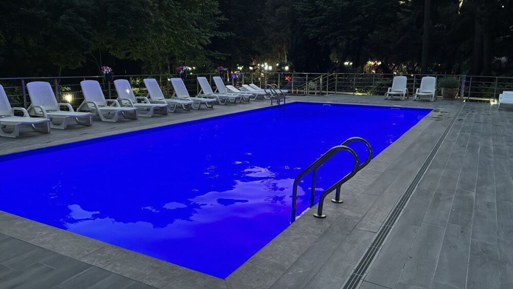 — бассейн возле дома с шезлонгами и зонтами, для удобства рядом расположены туалеты ,