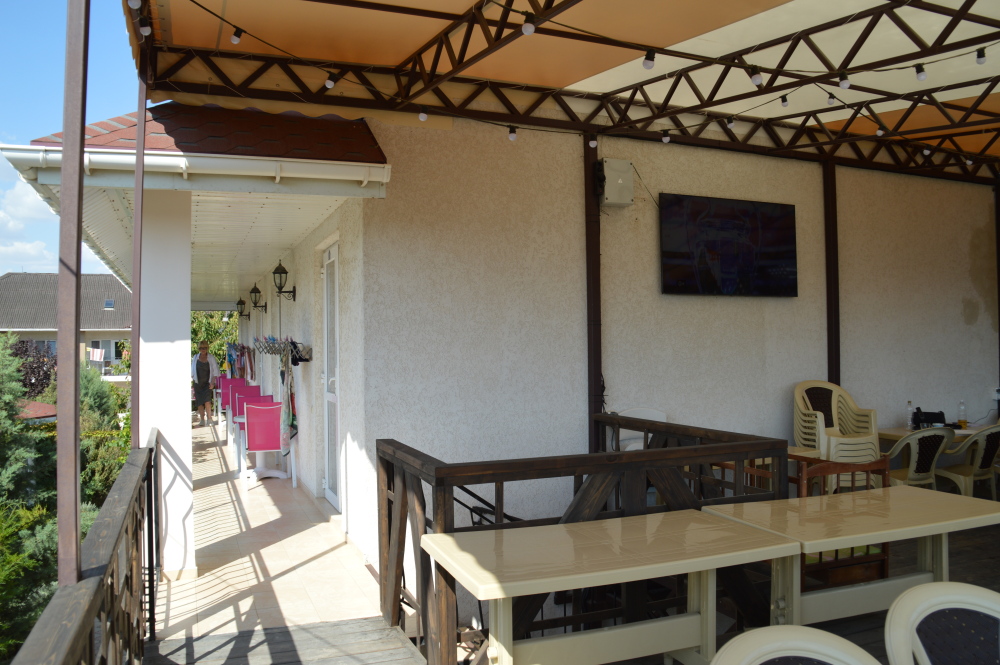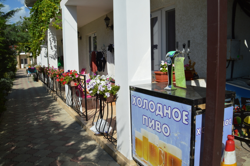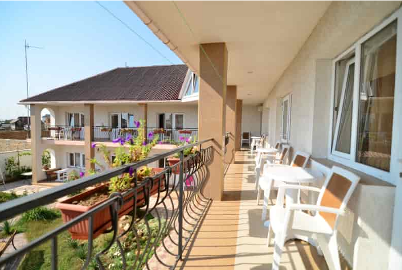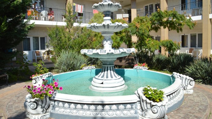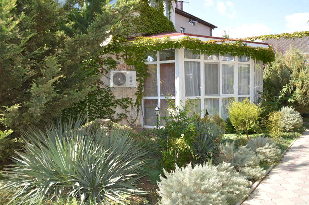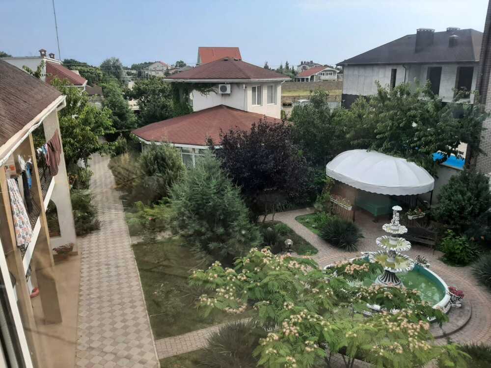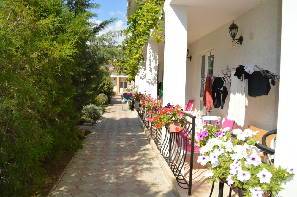 Территория гостевого дома закрыта для посторонних. Внутренний двор радует глаз свежим зеленым газоном, яркими цветочными клумбами, экзотическими растениями.