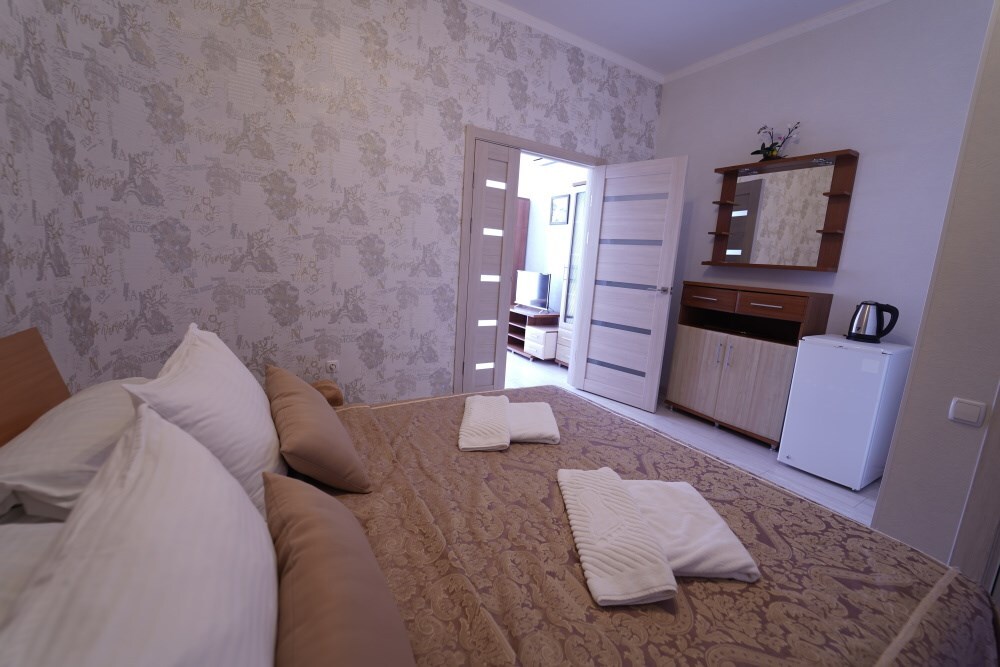 Двухкомнатный номер с собственной ванной комнатой. В номере кондиционер, телевизор, чайник, холодильник. Размещение на двуспальной кровати в одной комнате и раскладном диване в другой. Один ребёнок до 7 лет — можно без отдельного спального