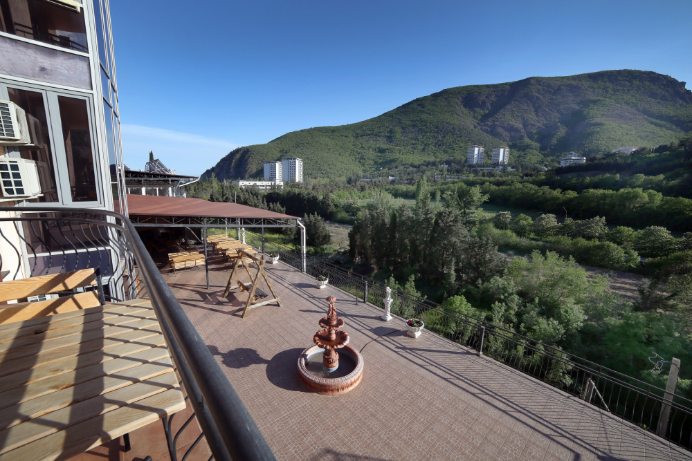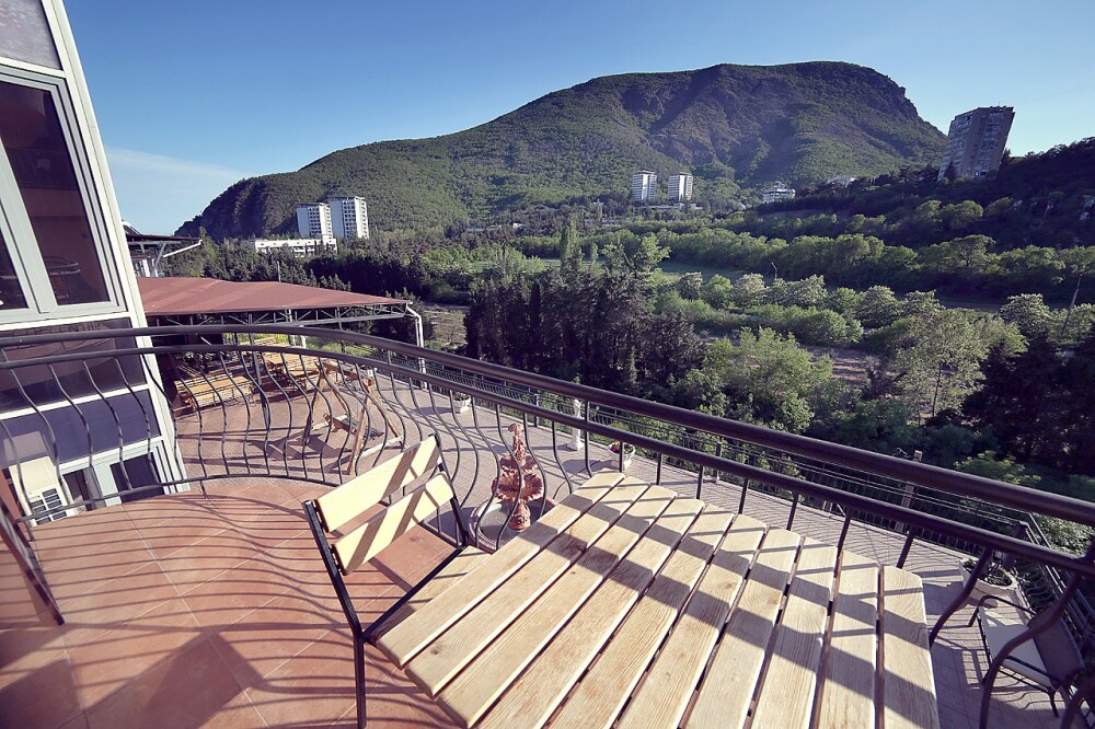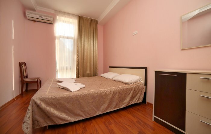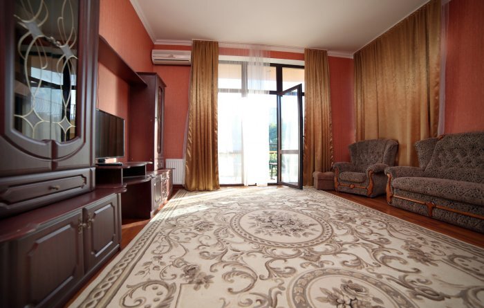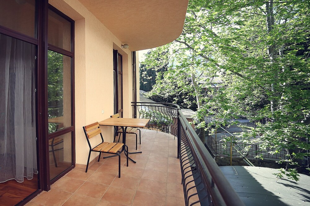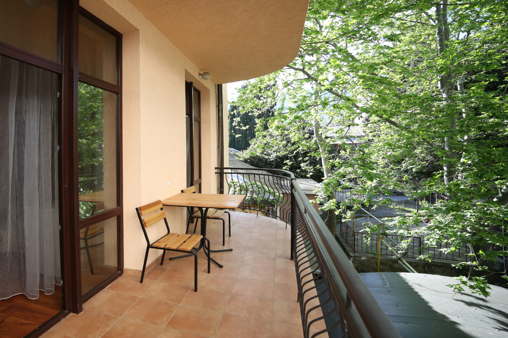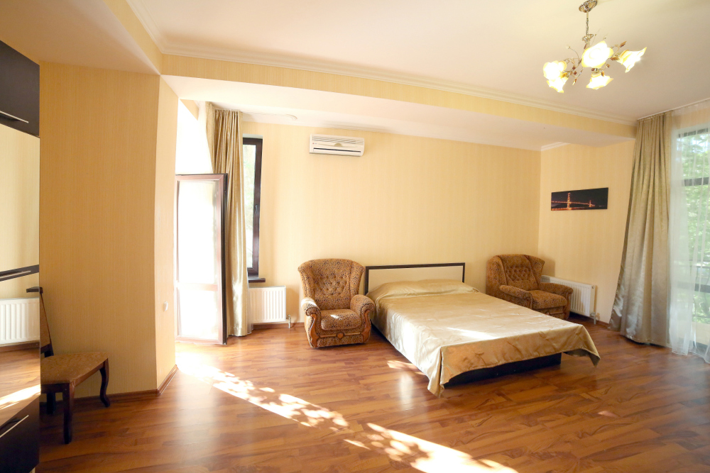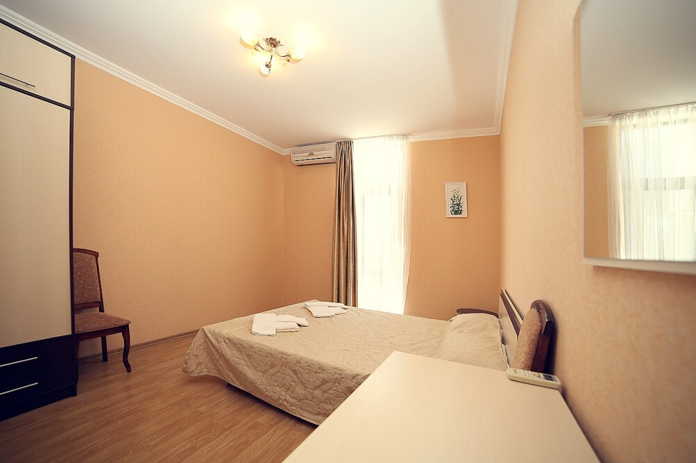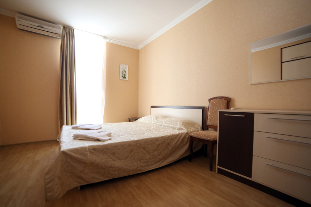 Просторный номер с балконом и видом на Медведь-гору. Или без балкона. В каждом номере кондиционер, телевизор, чайник, холодильник. Удобства в номере. Размещение на двуспальной кровати и раскладном кресле. Один ребёнок до 7 лет — можно без отдельного спального