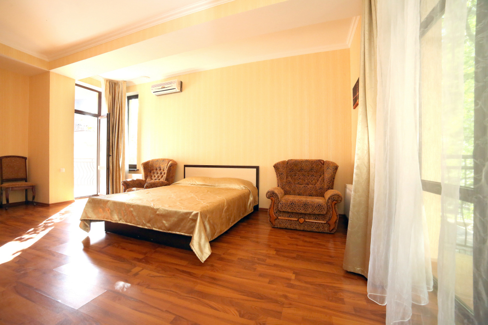 Доступны 4 просторных двухкомнатных номера различной планировки. С выходом на видовую террасу; с балконом и видом на Медведь-гору; с балконом на теневую сторону или не видовой номер с кухней. В каждой комнате этих номеров установлен кондиционер. В каждом номере телевизор, чайник, холодильник, собственная ванная комната. Размещение на двуспальной кровати, раскладном диване, раскладном кресле. Один ребёнок до 7 лет — можно без отдельного спального