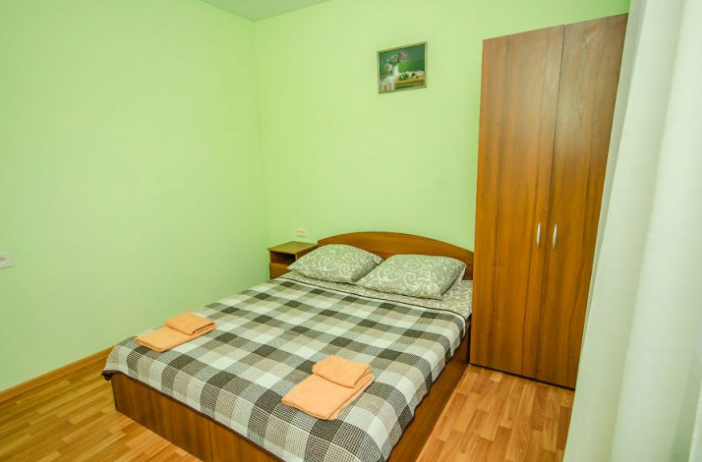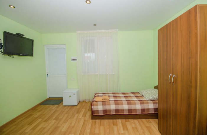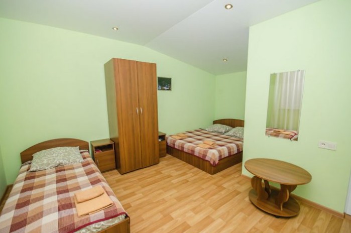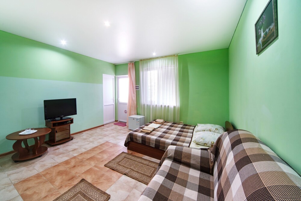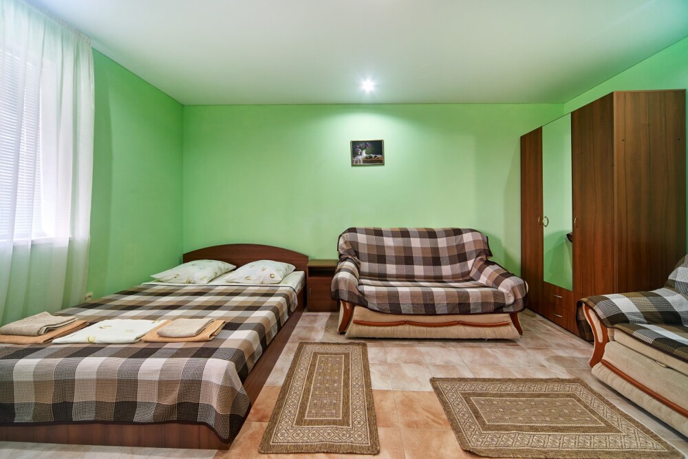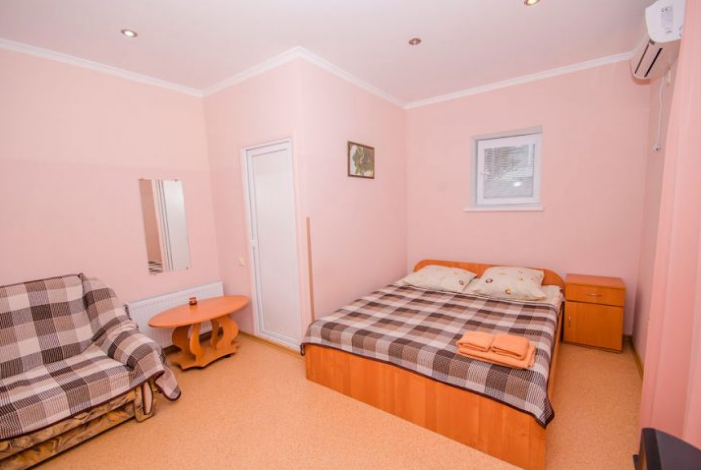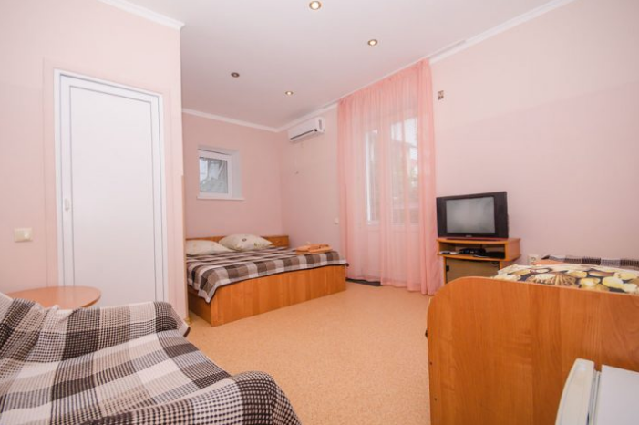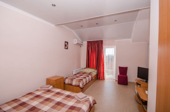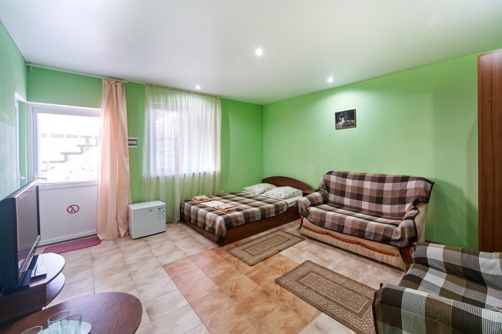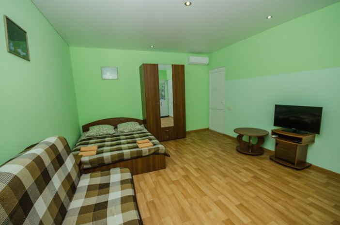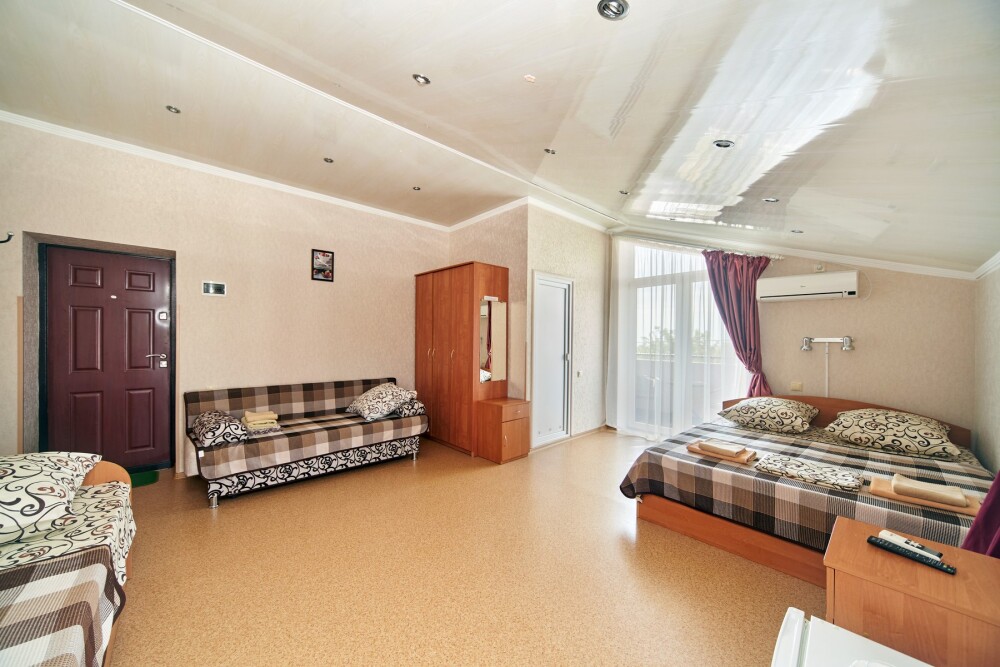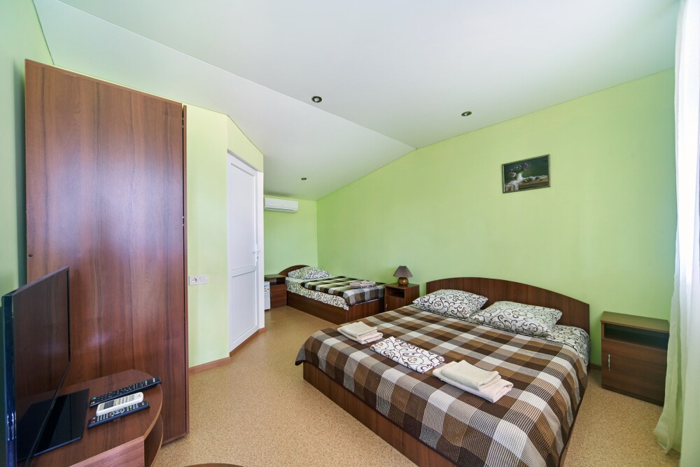 Комната оборудован двумя кроватями - полуторной и двуспальной, раскладным двуспальным диваном, платяным шкафом, прикроватными тумбочками, стульями, холодильником и телевизором, кондиционером.