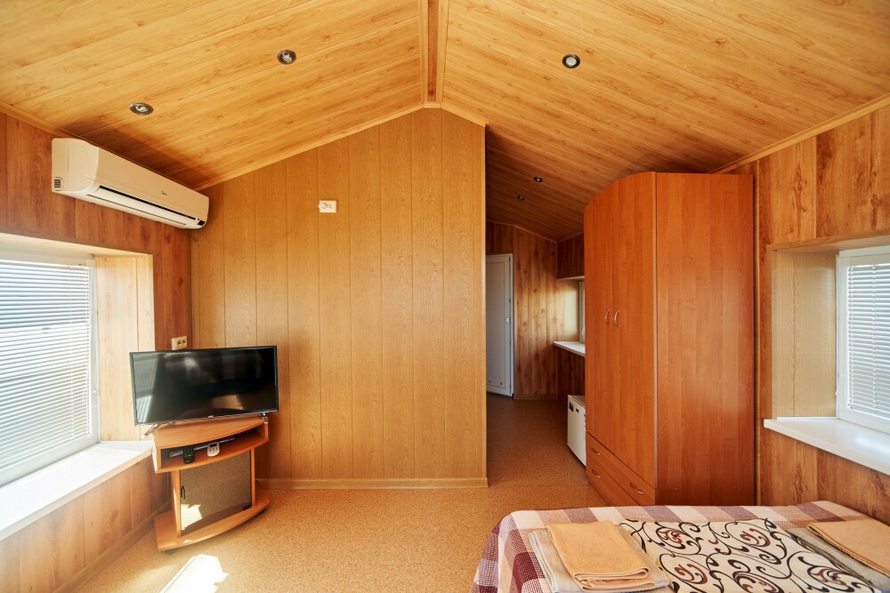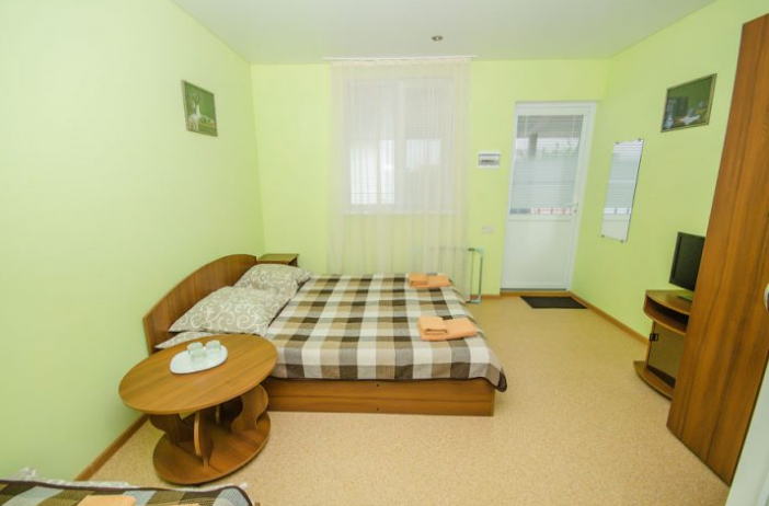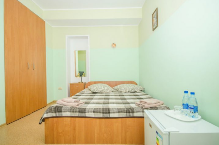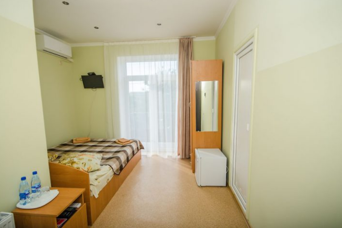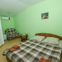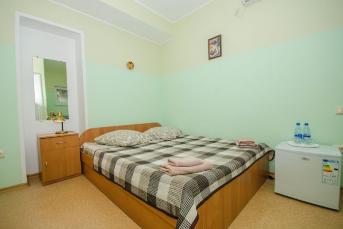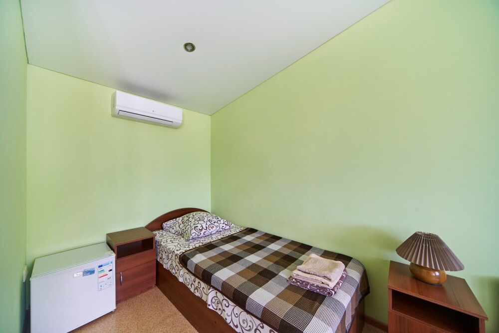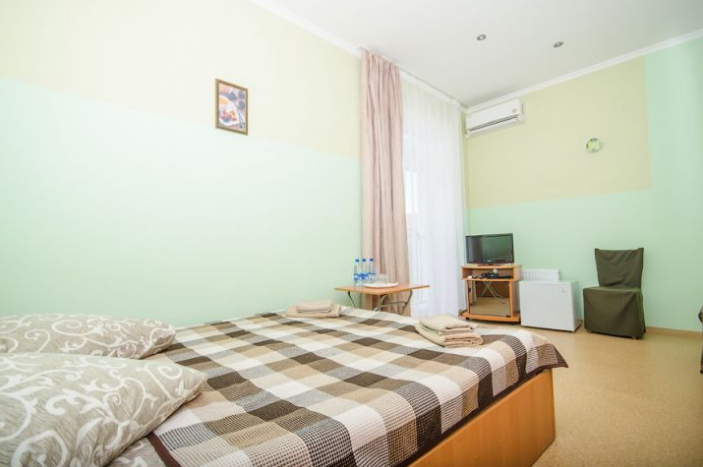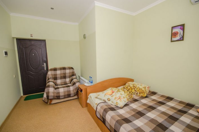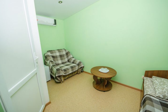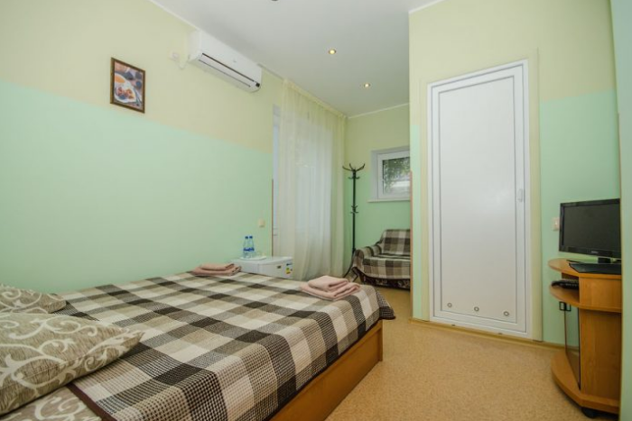 В комнате расположены двуспальная кровать, раскладное кресло, платяной шкаф, прикроватная тумбочка, журнальный столик, холодильник, телевизор, кондиционер. В комнате может разместиться до 3 человек.