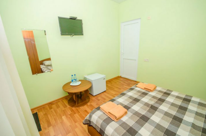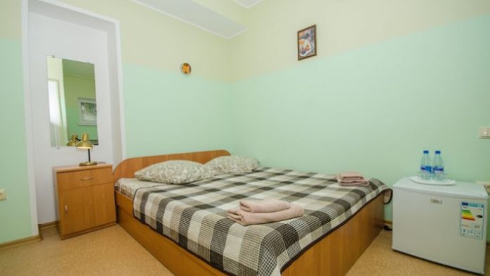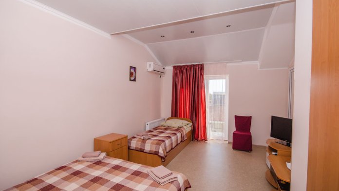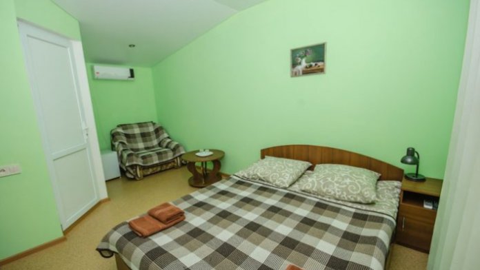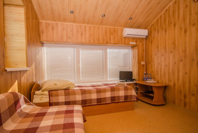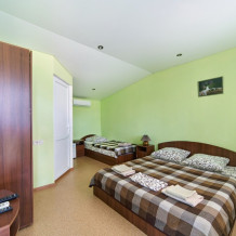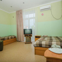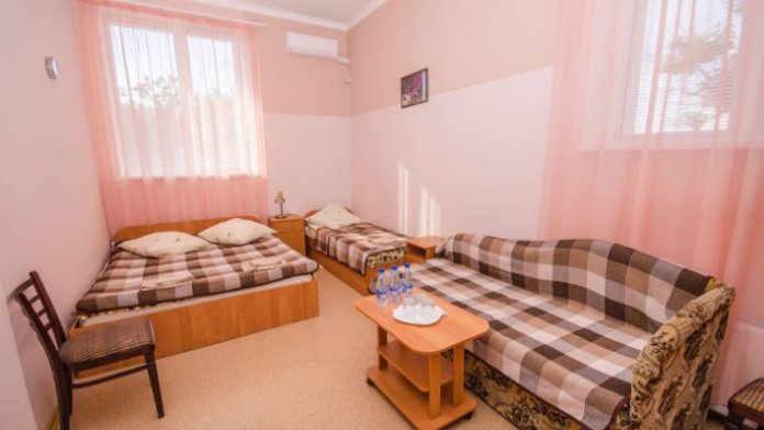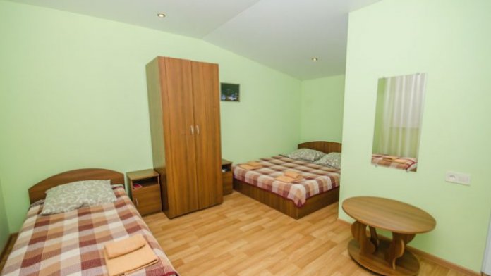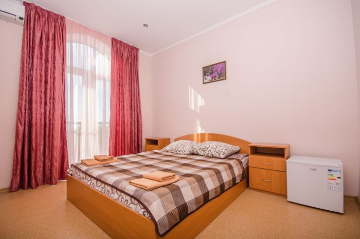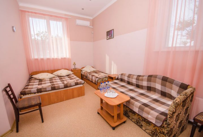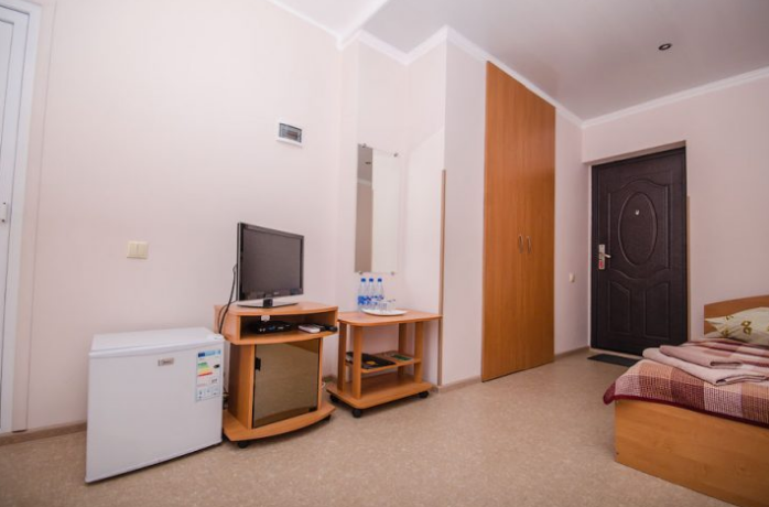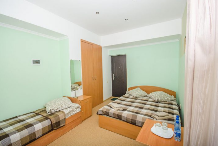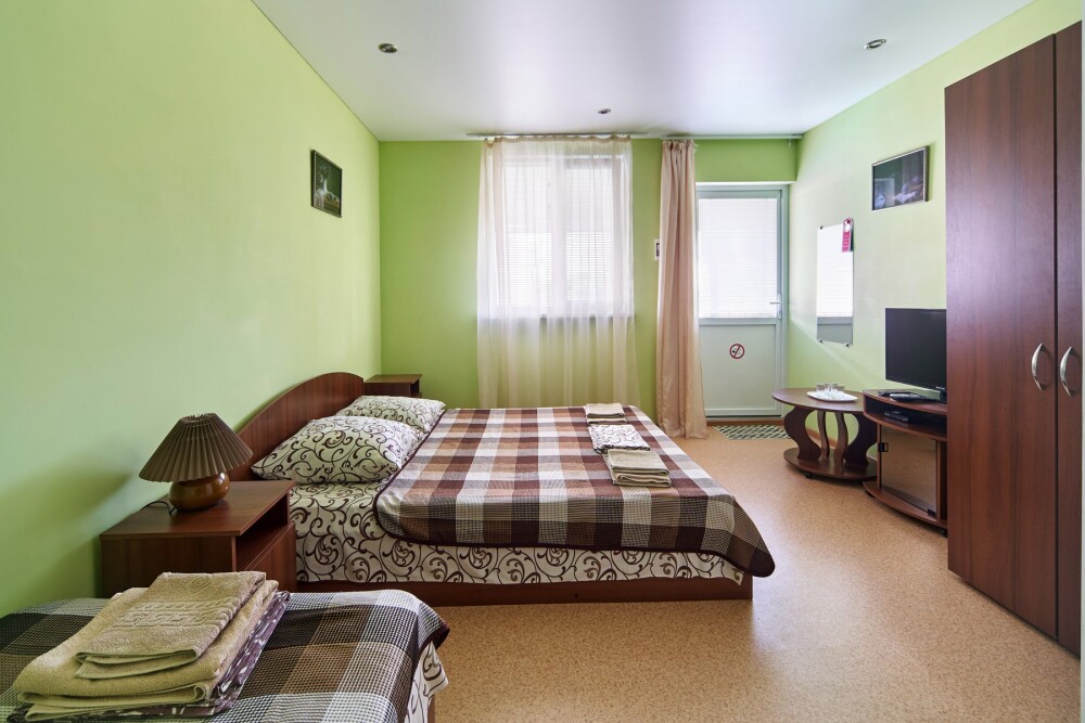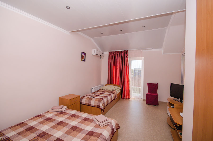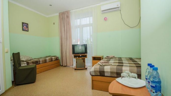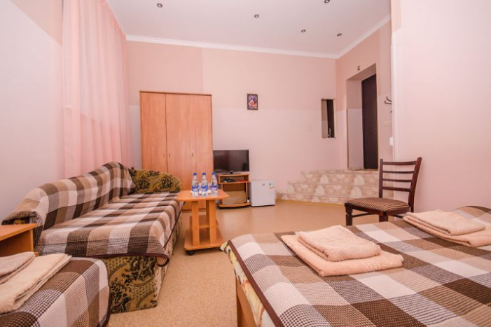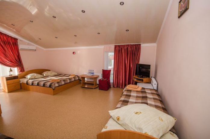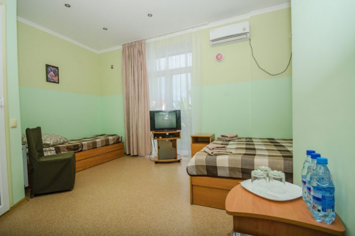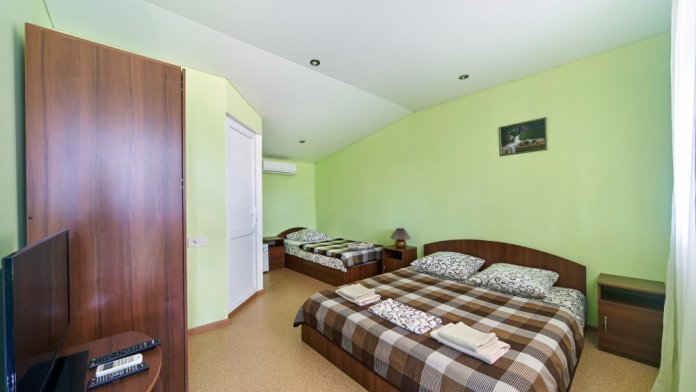 В номере – две полуторных кровати и двуспальная, раскладное кресло, платяной шкаф, прикроватные тумбочки, стулья, холодильник и телевизор, кондиционер, санузел. Пятое место оплачивается как дополнительное.