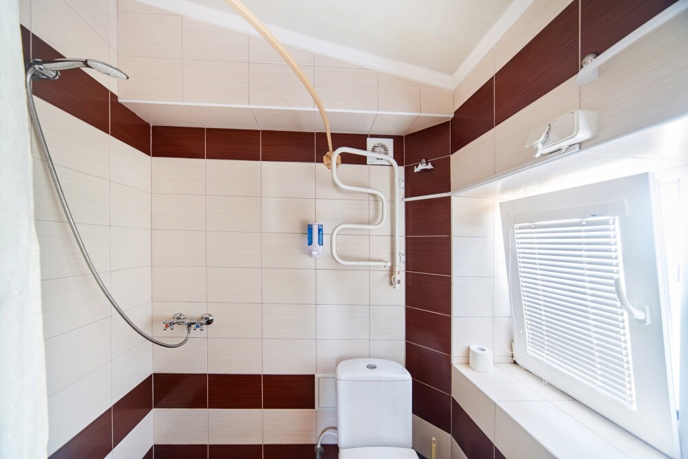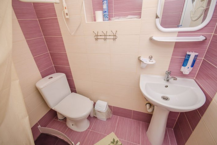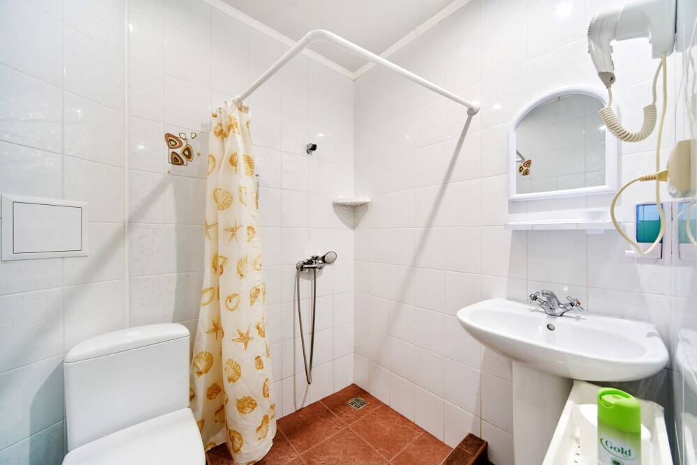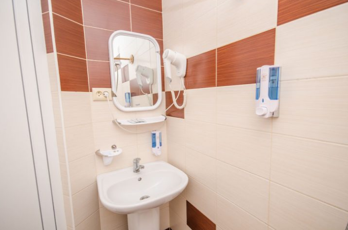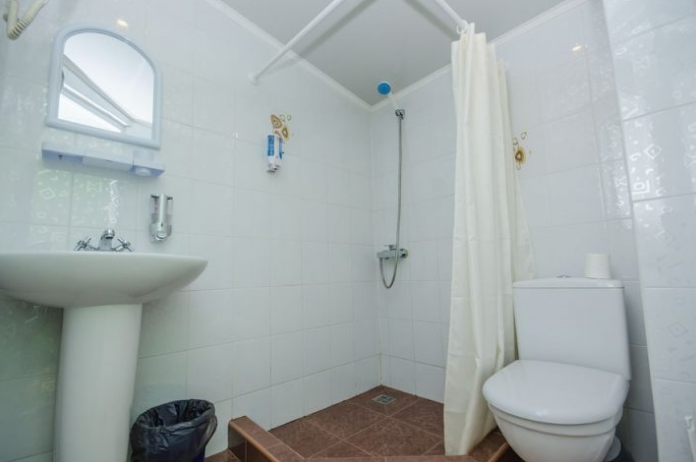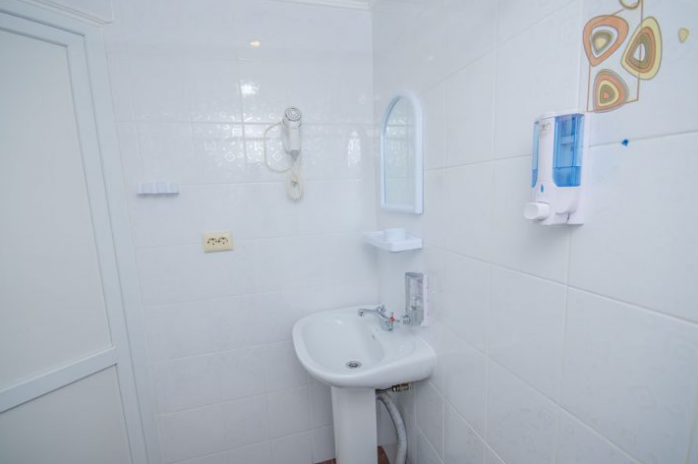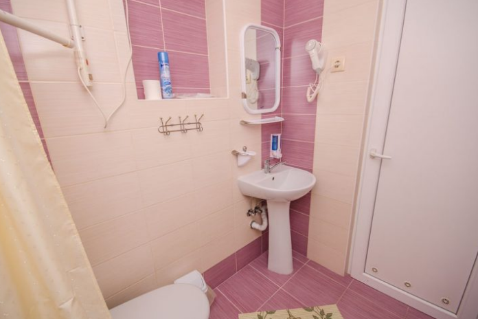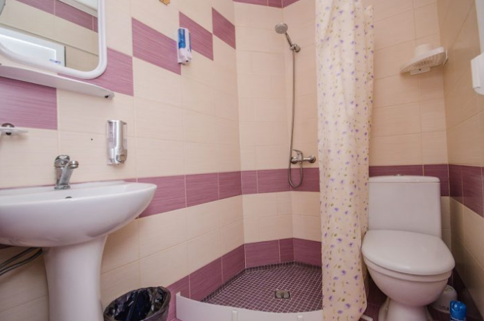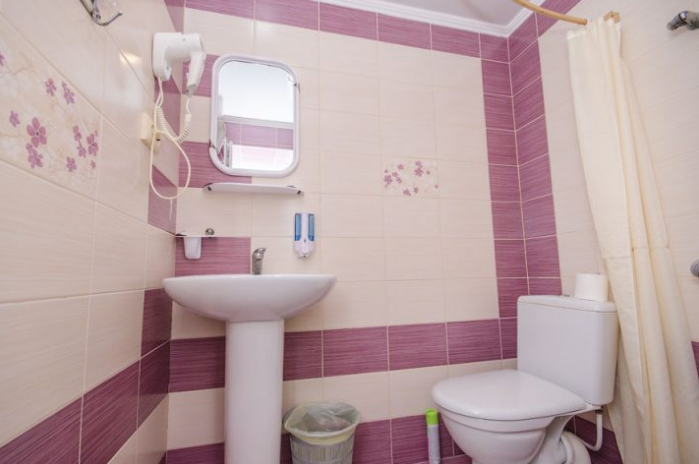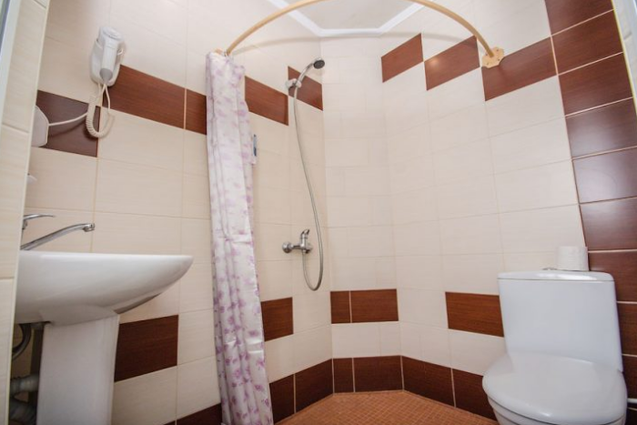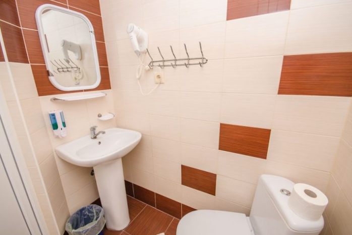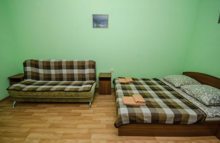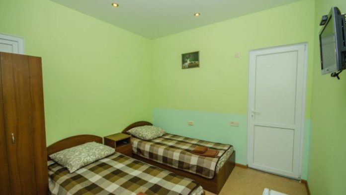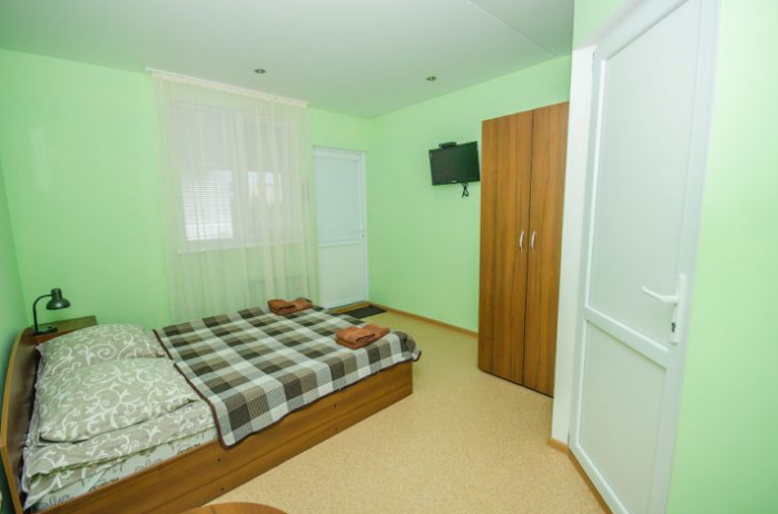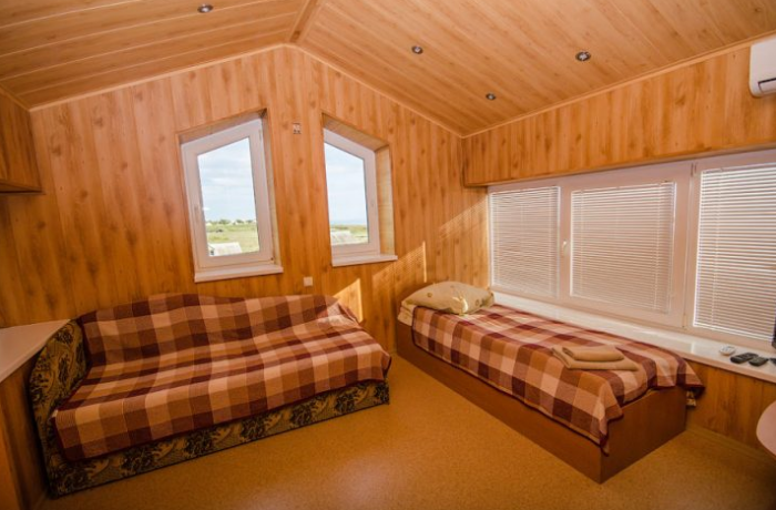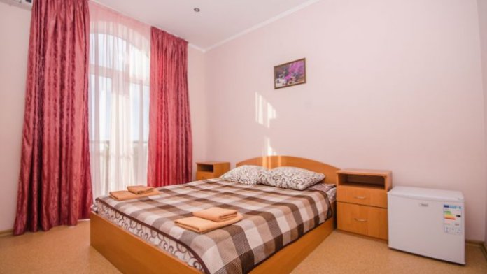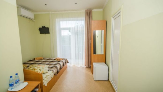 В номере – две полуторных кровати и двуспальная, раскладное кресло, платяной шкаф, прикроватные тумбочки, стулья, холодильник и телевизор, кондиционер, санузел. Пятое место оплачивается как дополнительное.