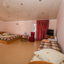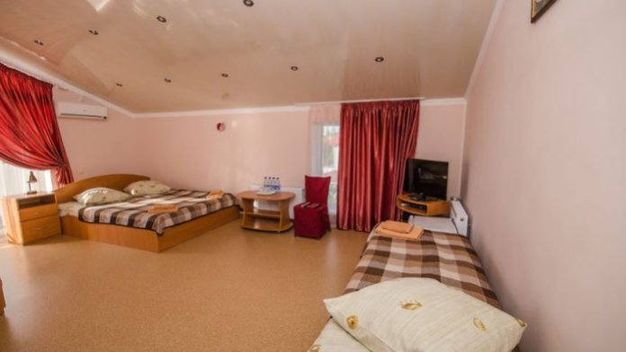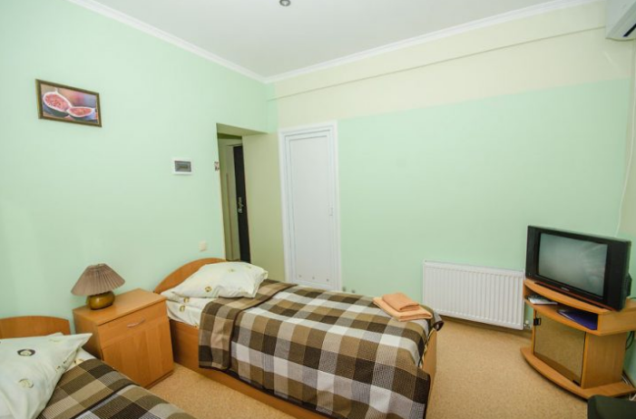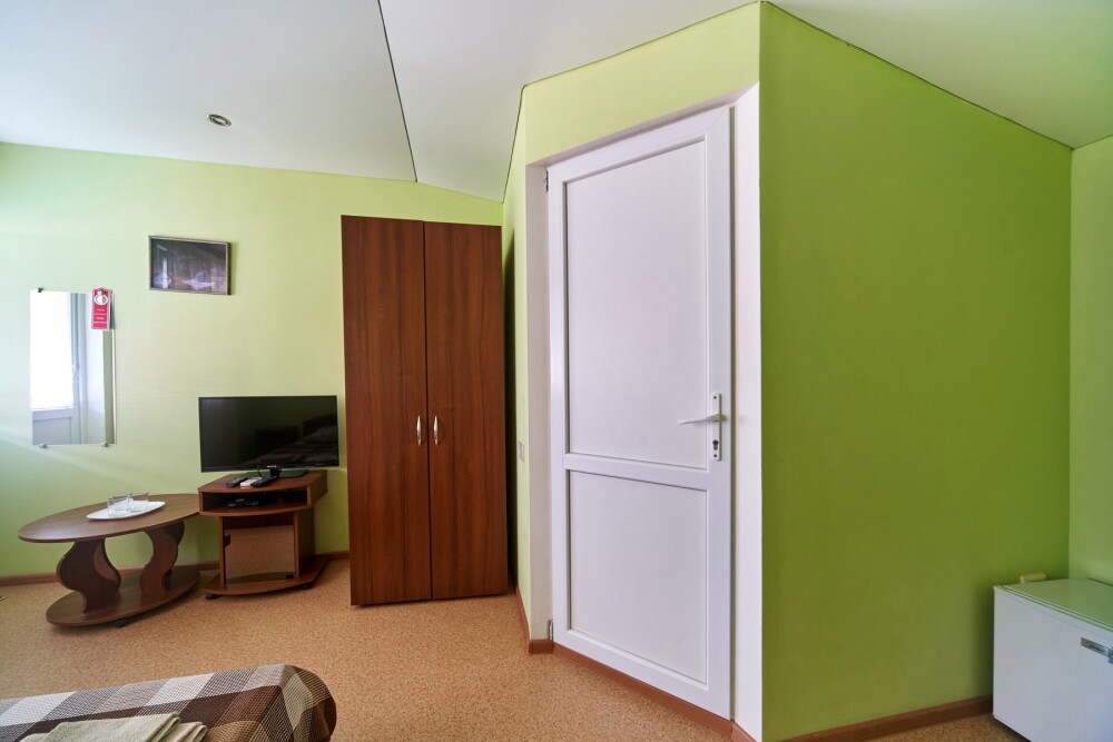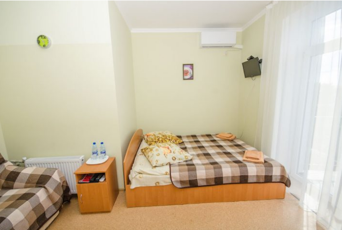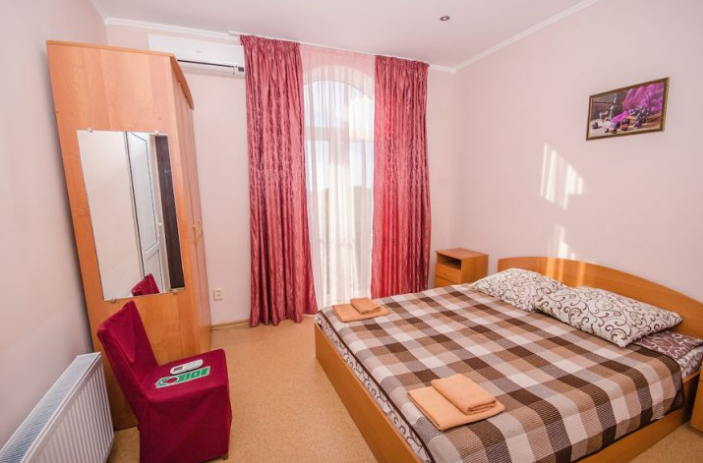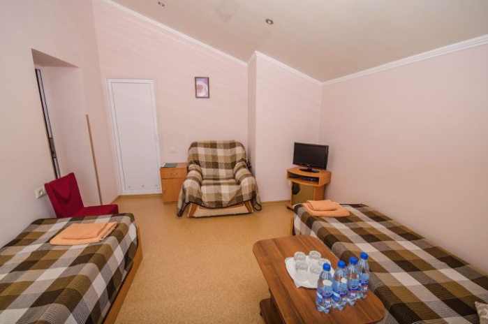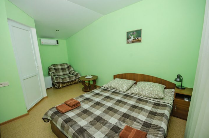 В номере: двуспальная и полуторная кровати, раскладное кресло, платяной шкаф, прикроватная тумбочка, журнальный столик, холодильник, телевизор, кондиционер.