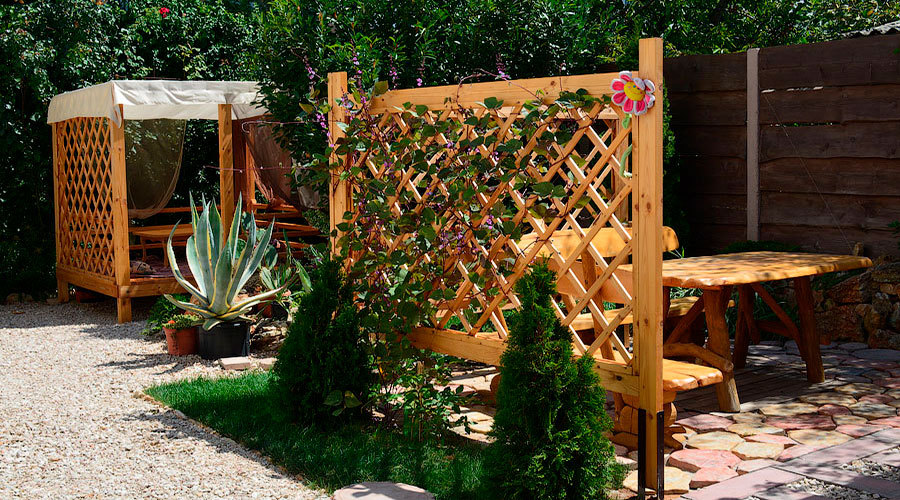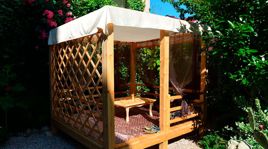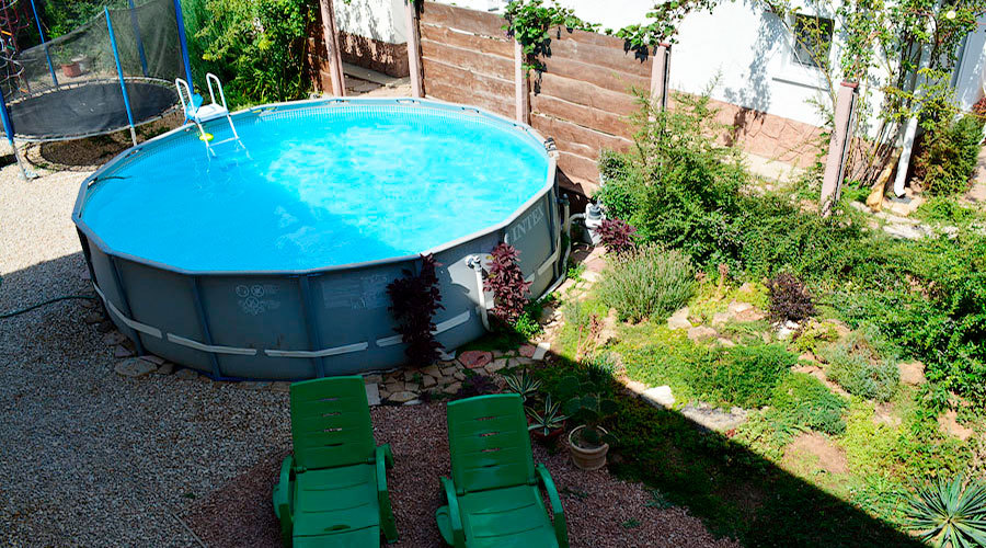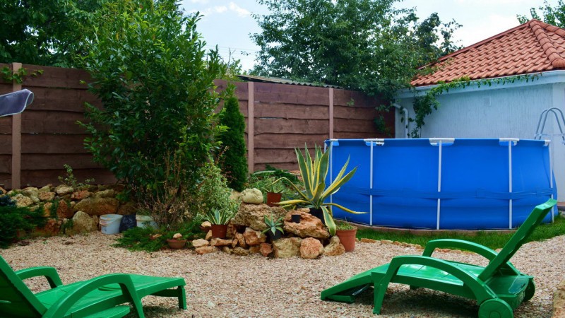 Просторная комната с выходом к бассейну для семьи из 4-5 человек оборудован двуспальной и полуторной кроватями, платяным шкафом, прикроватными тумбочками, стульями, журнальным столиком, холодильником, телевизором, кондиционером и санузлом. Рядом с комнатой находится свое место для отдыха- стол и кресла, качели.