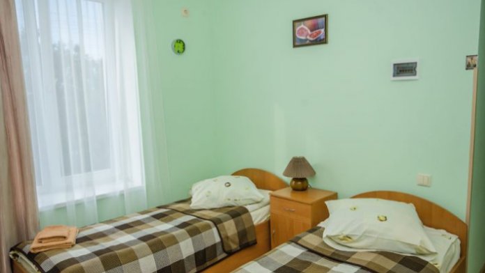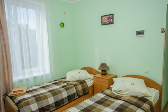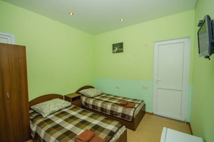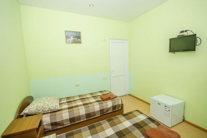 Удобная комната оснащена двумя отдельными полуторными кроватями, которые при необходимости могут совмещаться, а также платяным шкафом, прикроватными тумбочками, стульями, журнальным столиком, холодильником и телевизором.