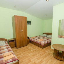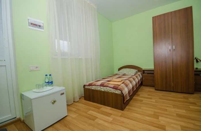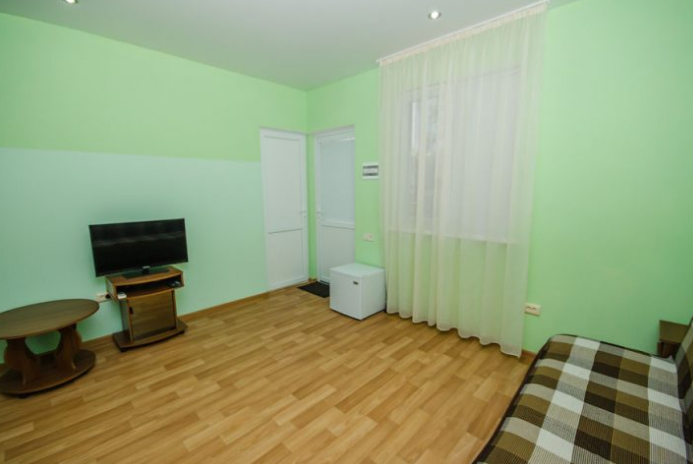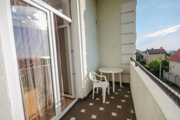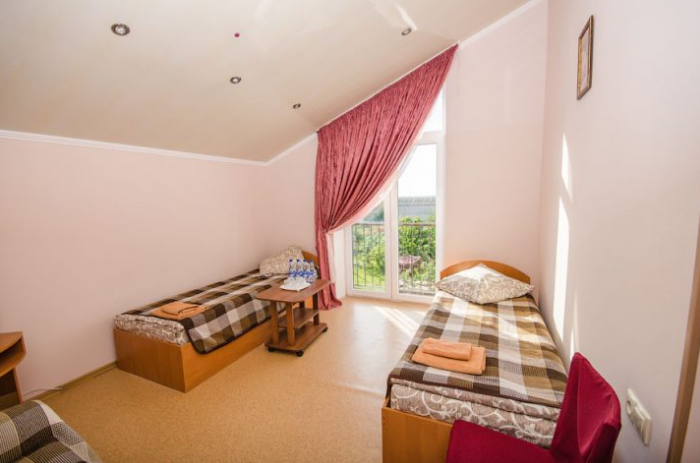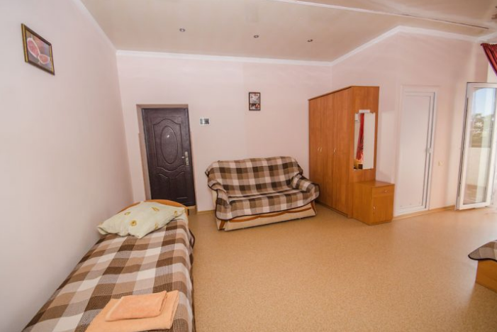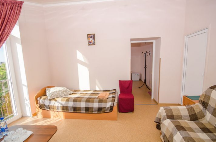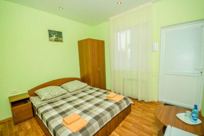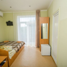 Удобная комната с французским балконом выходит во внутренний дворик, оснащена двуспальной и полуторной кроватями , платяным шкафом, прикроватной тумбочкой, стульями, журнальным столиком, холодильником и телевизором.