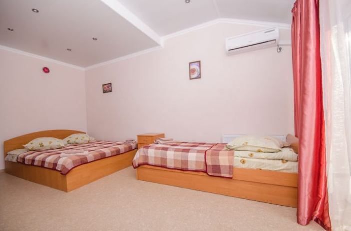 В комнате находятся две кровати - полуторная и двуспальная, раскладной двуспальный диван, платяной шкаф, прикроватные тумбочки, стулья, холодильник и телевизор, кондиционер, санузел.