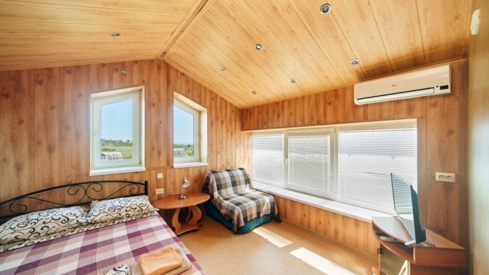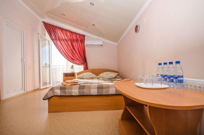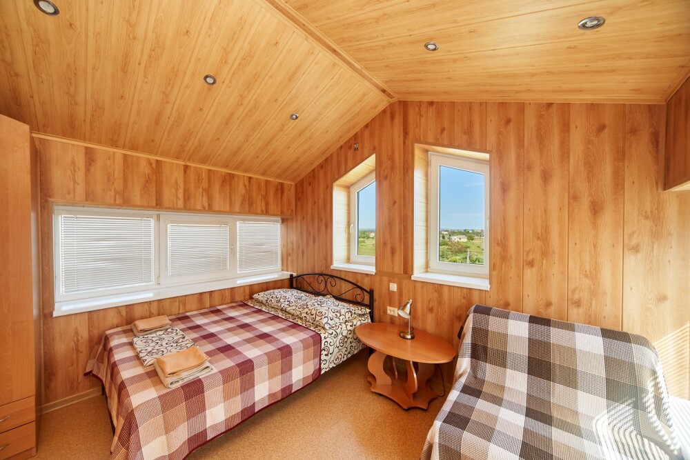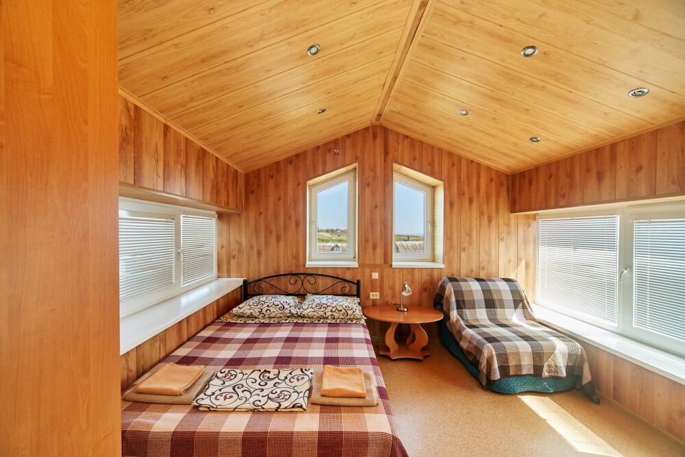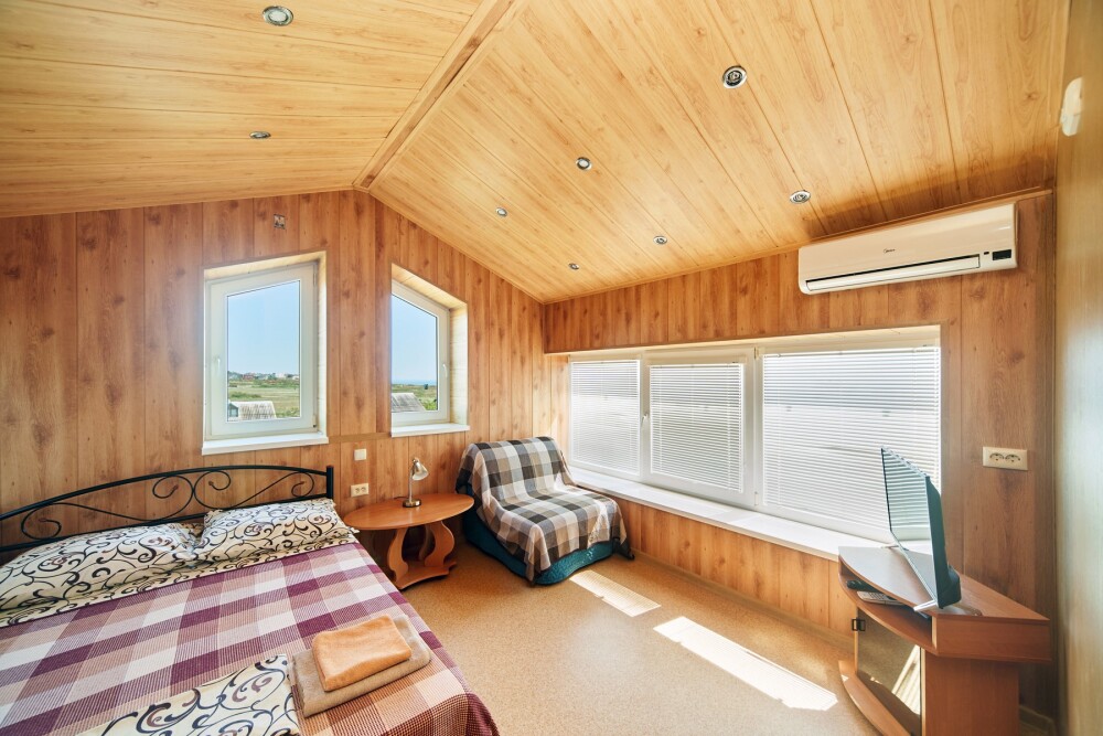 Комната расположена на мансардном этаже и отличается наличием панорамных окон, из которых открывается великолепный вид на море и город. Оснащена двуспальной кроватью и раскладным креслом-кроватью, платяным шкафом, журнальным столиком, холодильником, телевизором, кондиционером.