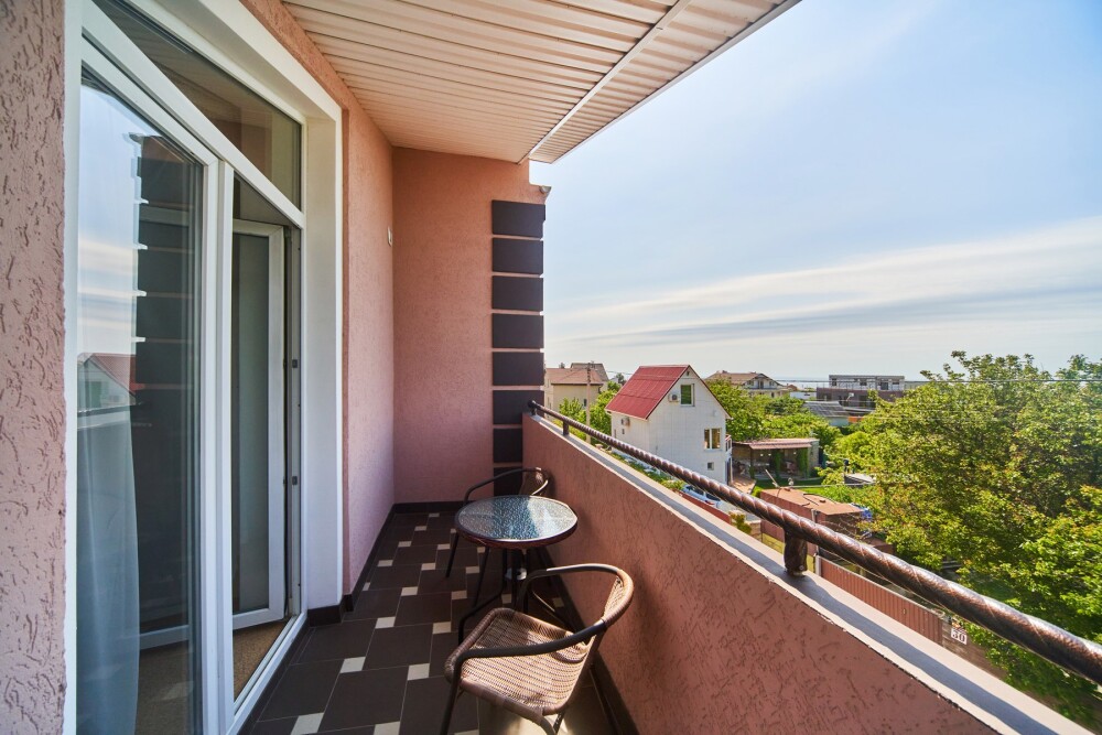Уютная комната с большим балконом, на котором можно посидеть за столиком с чашечкой кофе.
