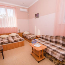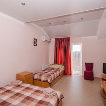 Уютная комната для 3 человек оборудована двуспальной и полуторной кроватями, платяным шкафом, прикроватными тумбочками, стульями, журнальным столиком, холодильником, телевизором, кондиционером. Рядом с комнатой на общей террасе находится место для отдыха - столик и кресла. Терраса выходит к бассейну