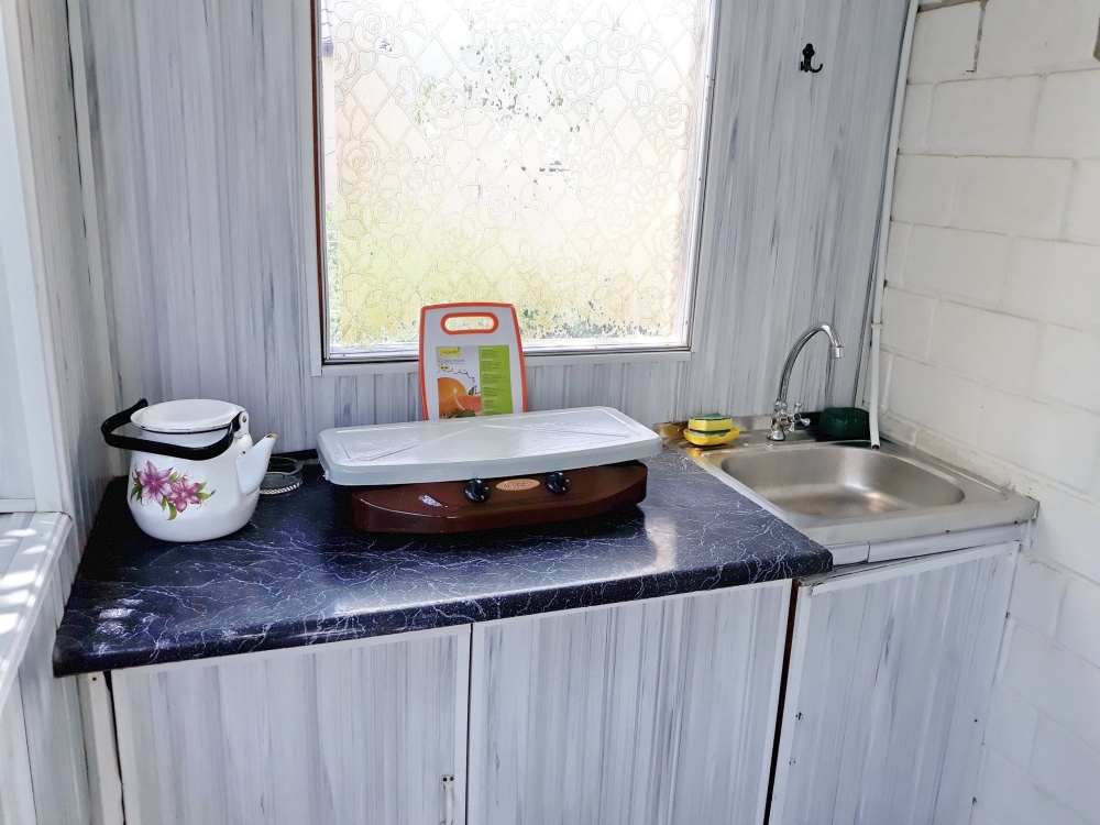 - кухня во дворе (холодильник, раковина, рабочий стол, посуда в комплекте, трехкомфорочная газовая плита, стеллаж);