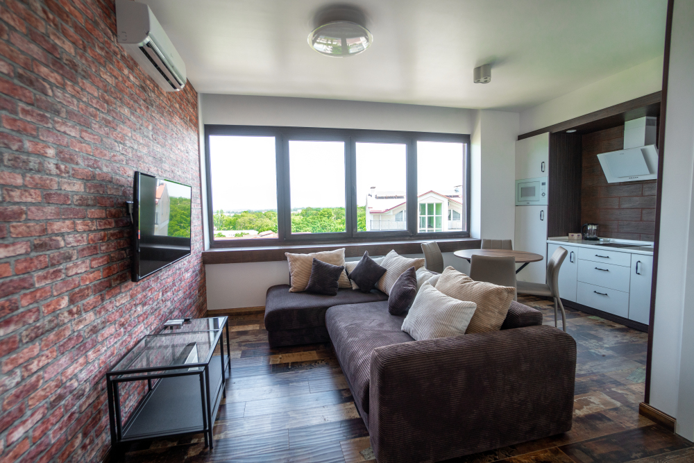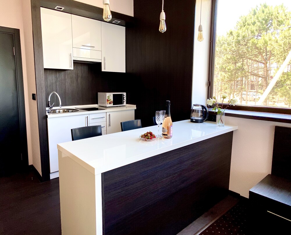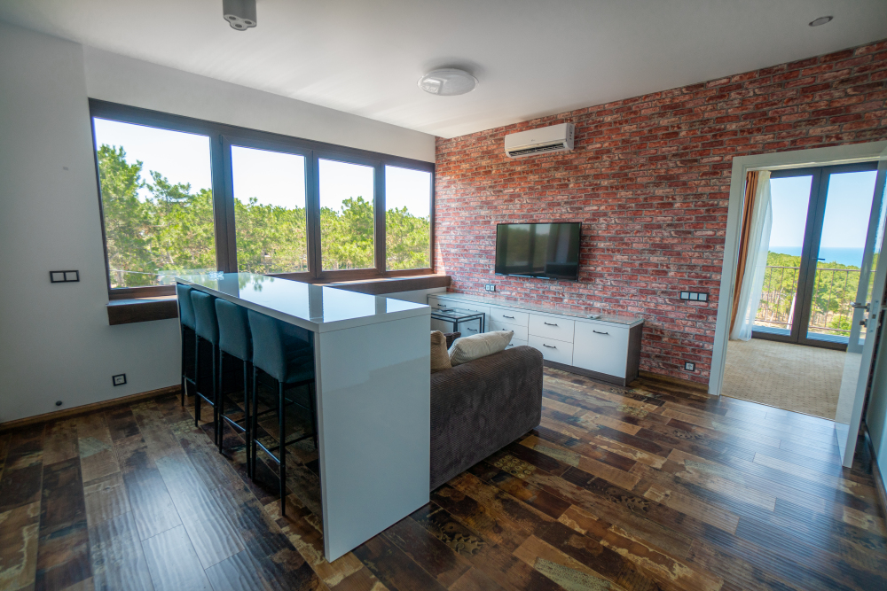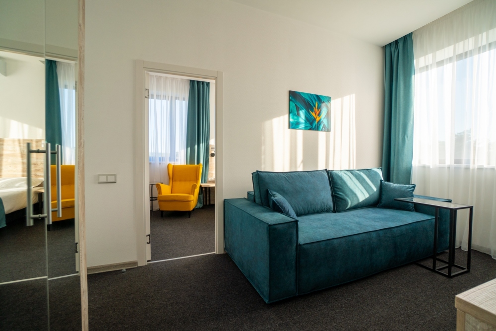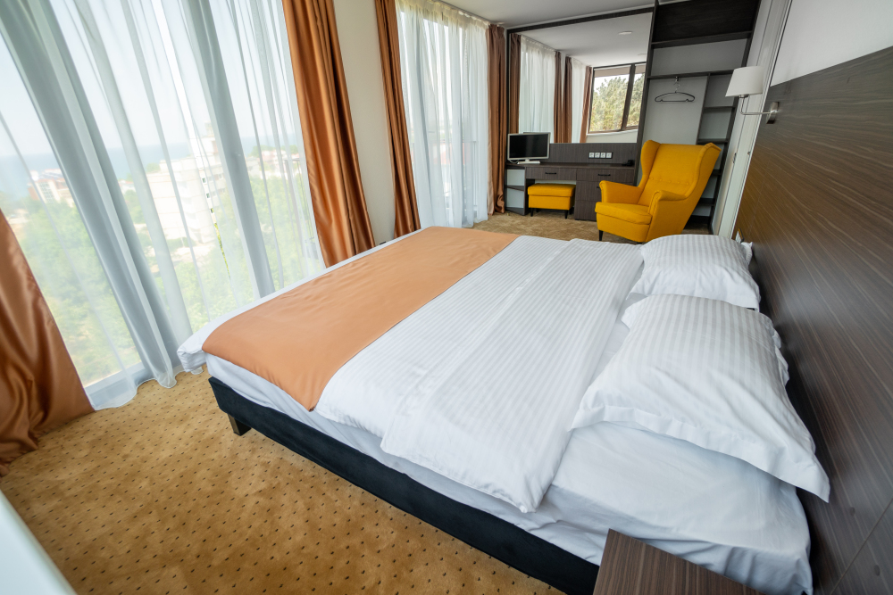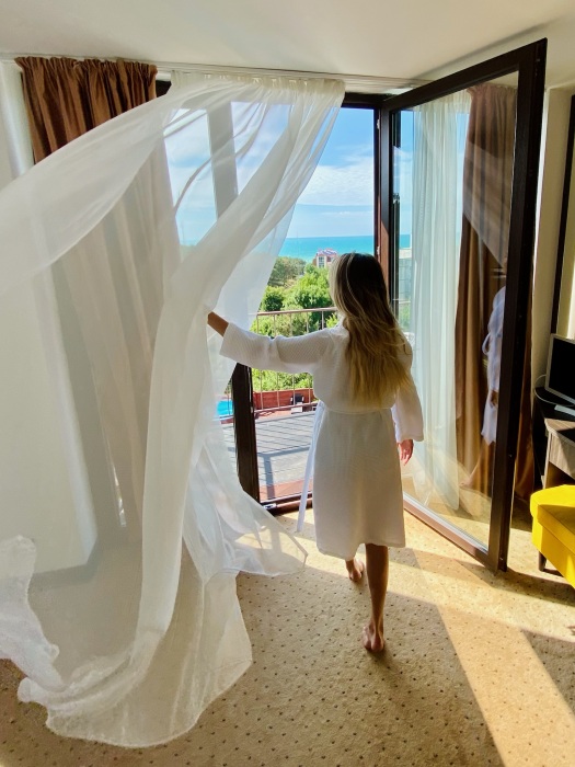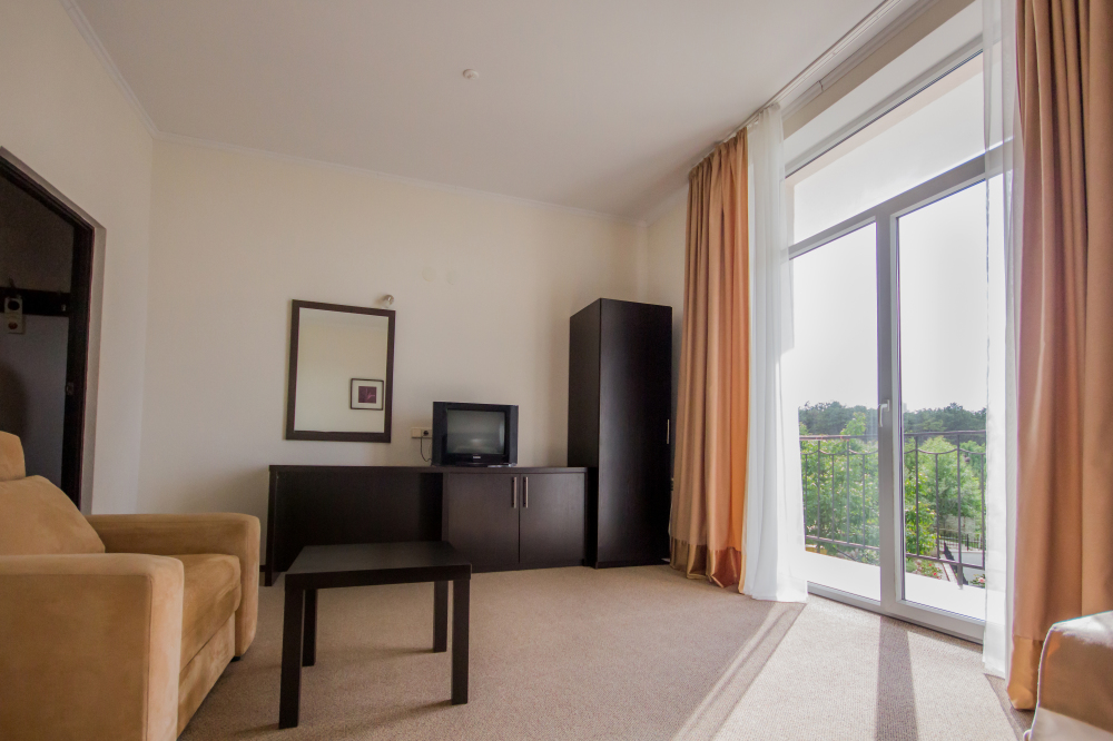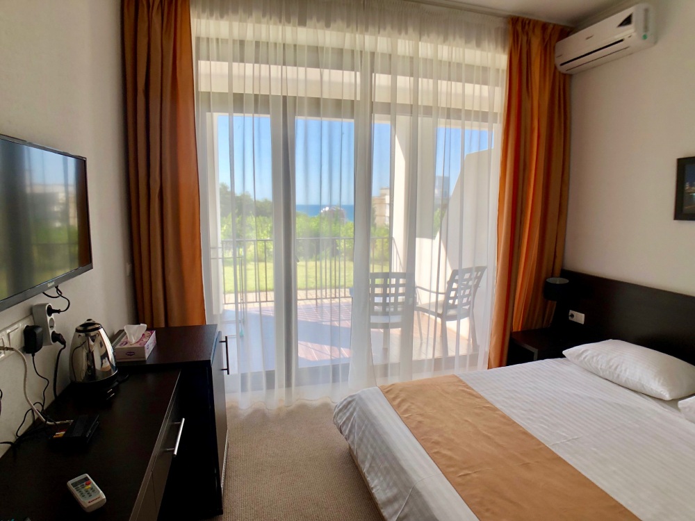 Двухкомнатный номер с понорамными окнами в пол из которых открывается великолепный вид на море.