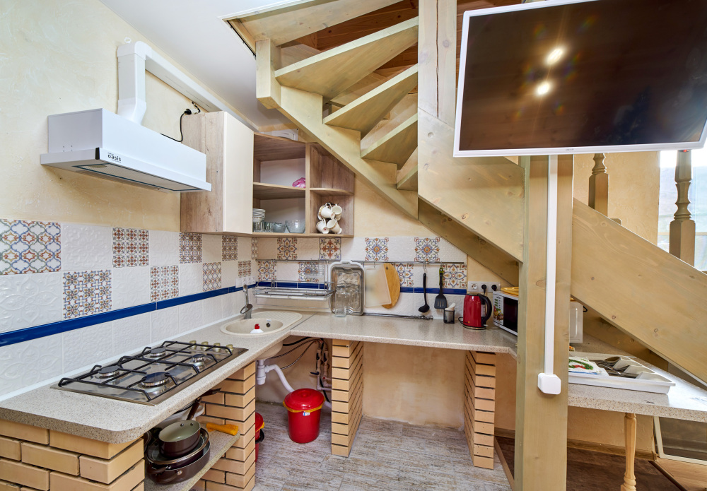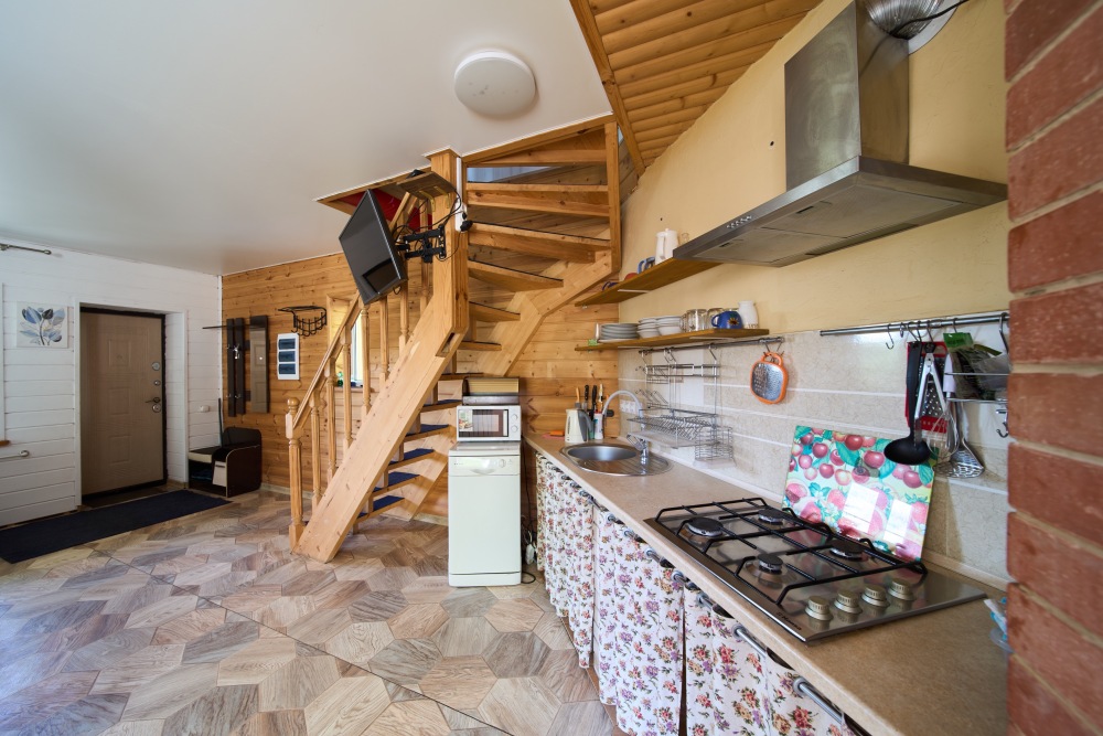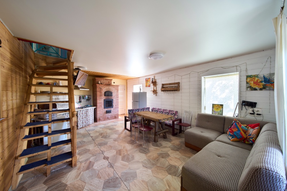 1 этаж: Гостиная с диваном и телевизором (спутниковое ТВ - Триколор); Кухня со всем необходимым (холодильник, варочная панель, микроволновая печь, чайник, посудомойка, а так же посуда, приборы, водонагреватель); Туалет.