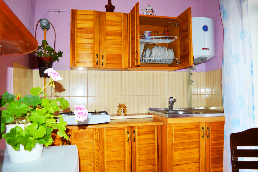 В доме: две односпальные кровати, которые сдвигаются в одну двуспальную кровать, телевизор, кондиционер, холодильник, кухня с набором всей необходимой посуды, санузел, WiFi интернет, есть подстилка для пляжа, зонтик- можно взять в бытовой комнате. Утюг есть в наличии и фен.