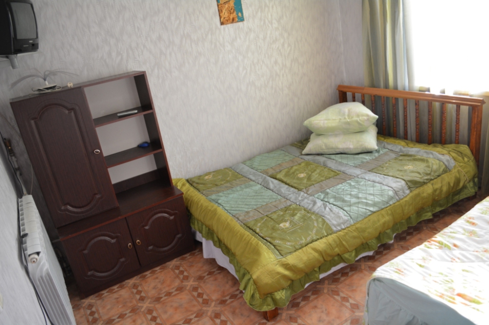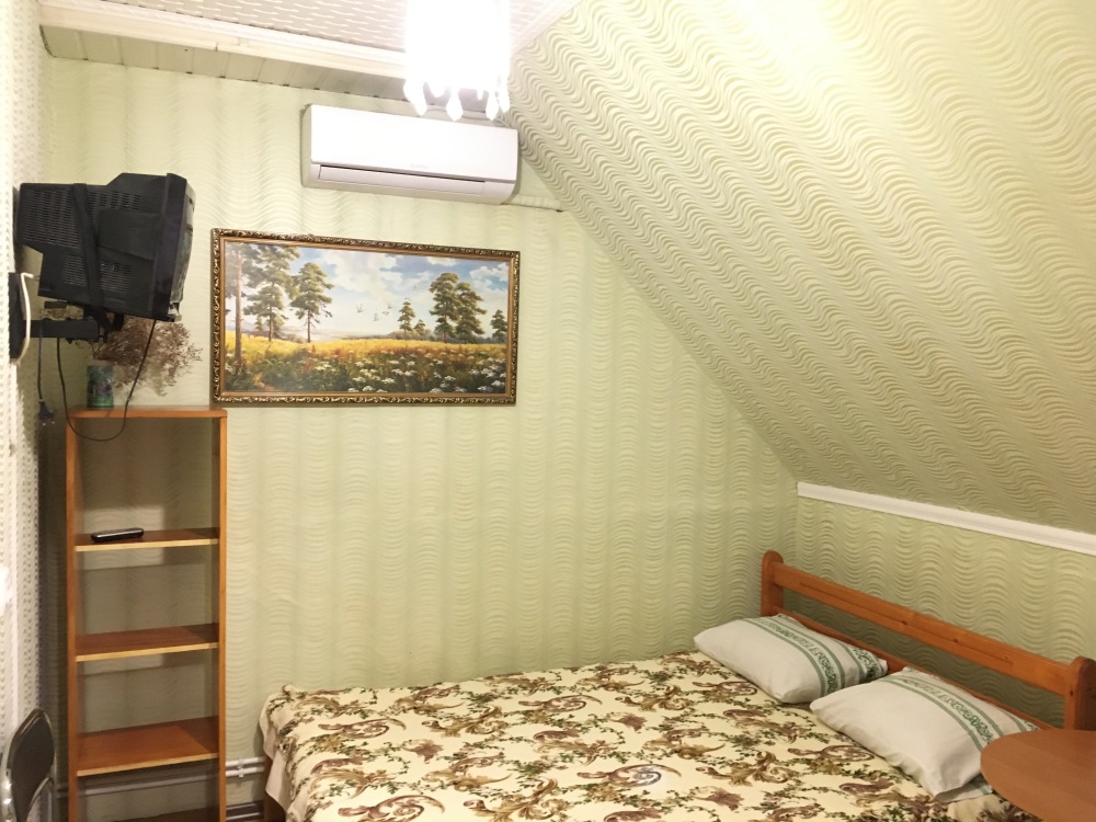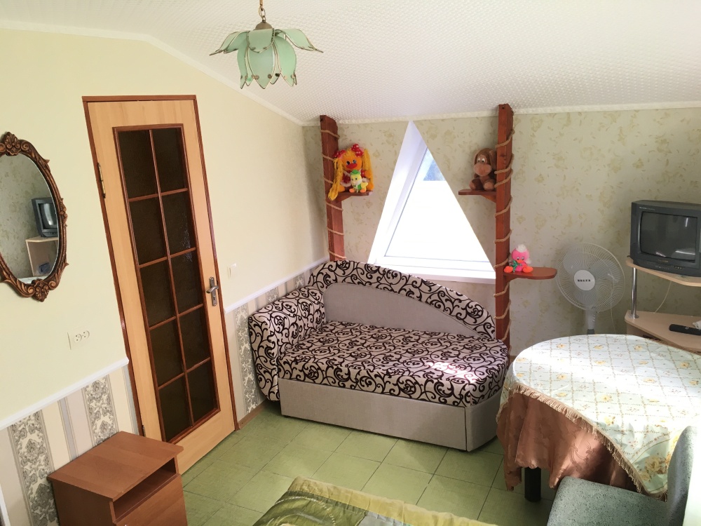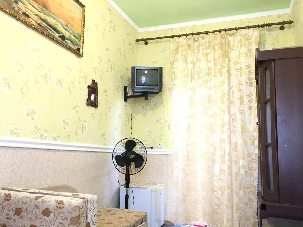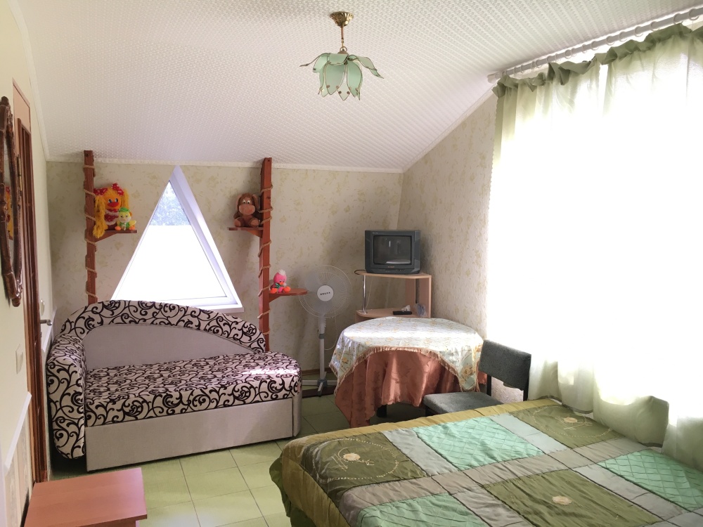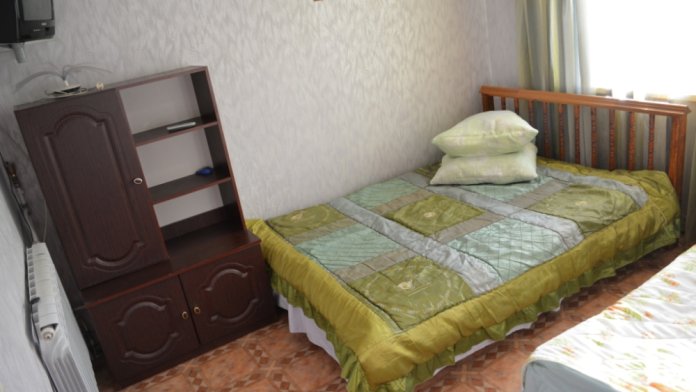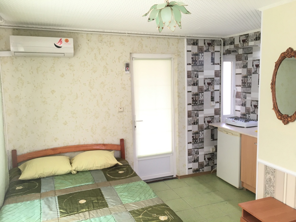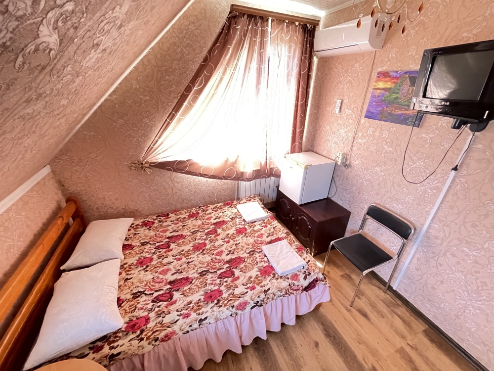 В номере находится 2-х спальная кровать с ортопедическим матрацем, кресло-софа, столик , стул, телевизор, холодильник, кабельное ТВ, WI-FI, кондиционер,вентилятор. Душевая и санузел на 2 номера.