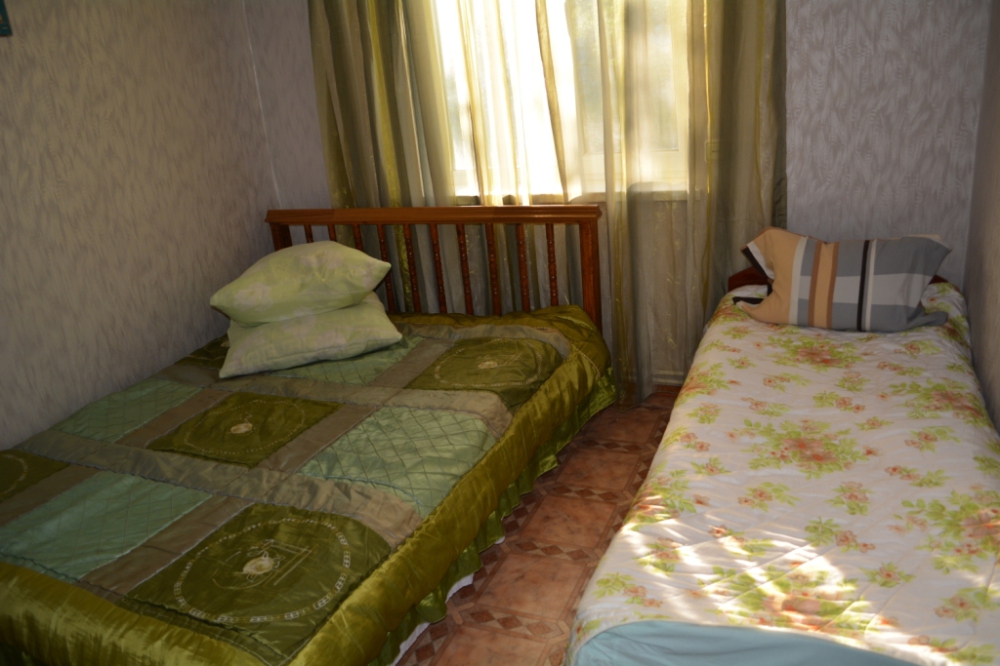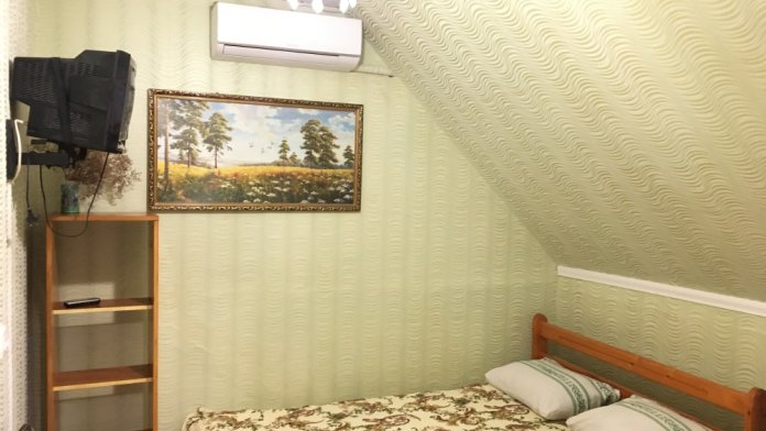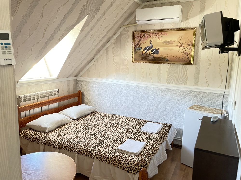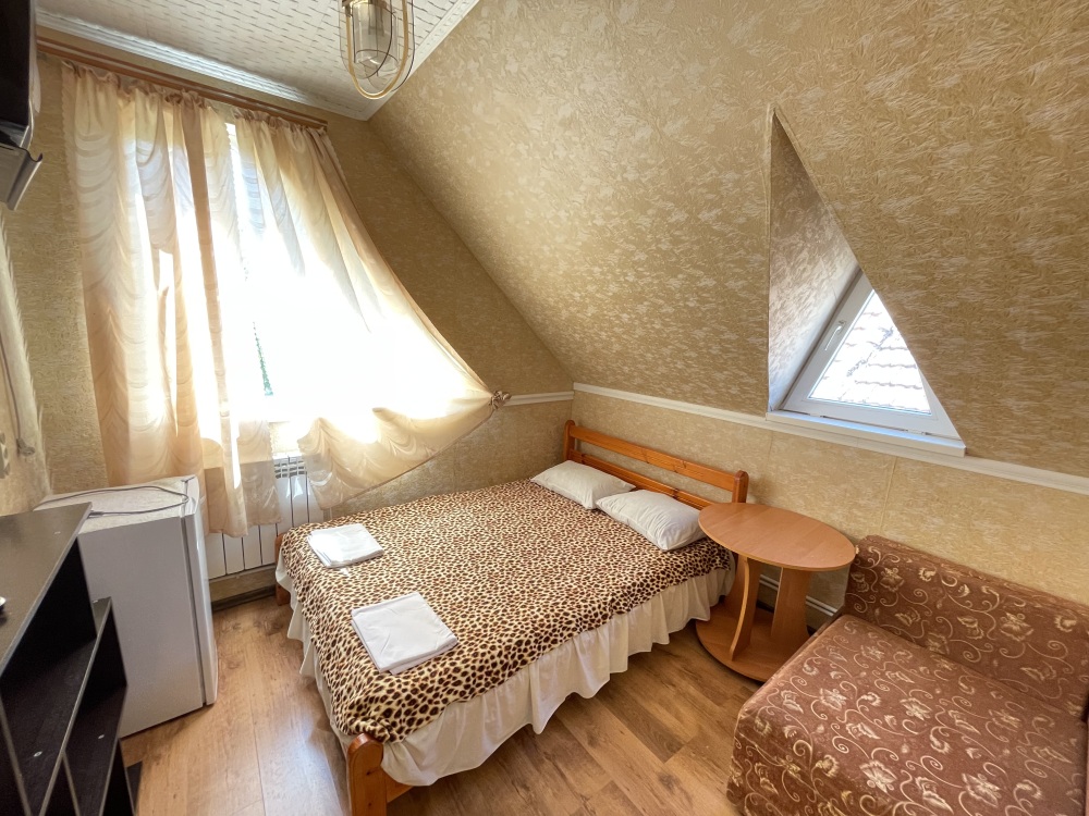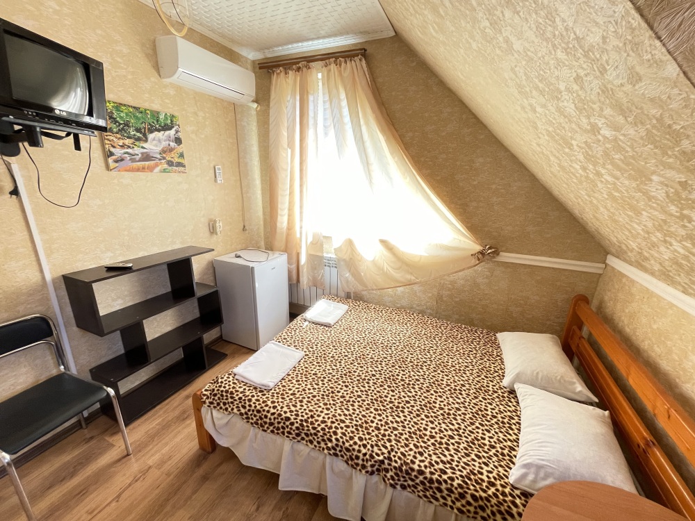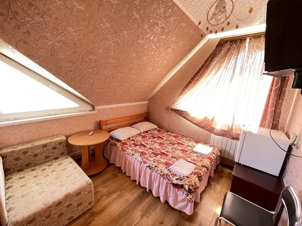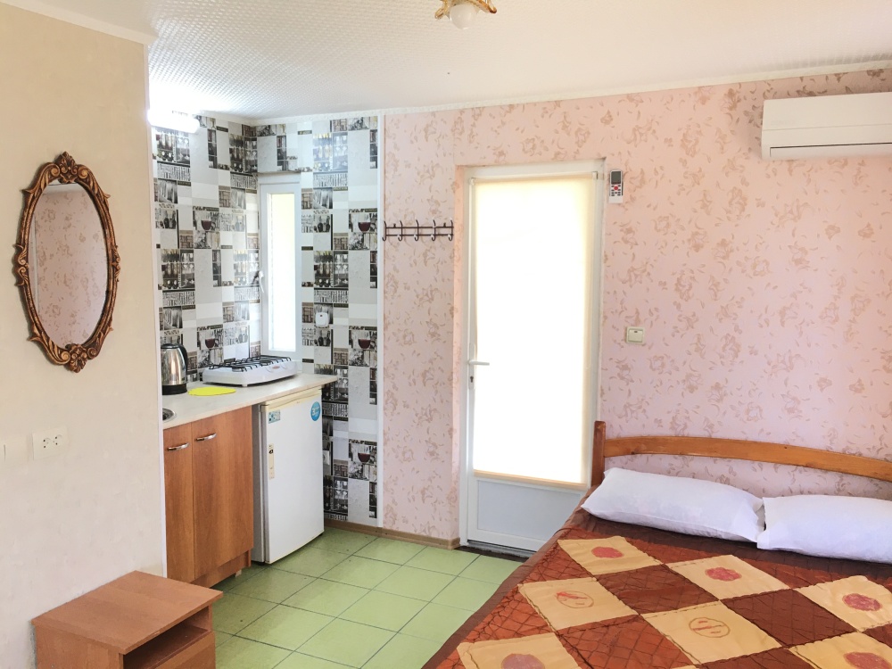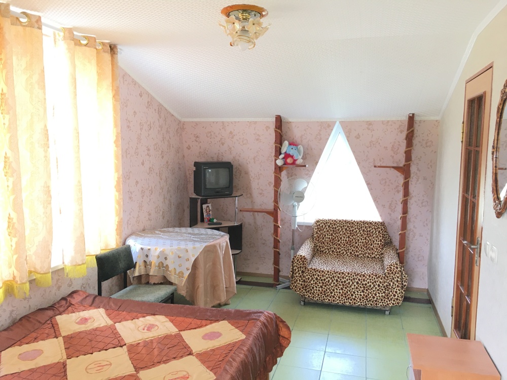 В номере находится 2-х спальная кровать с ортопедическим матрацем, кресло-софа, столик , стул, телевизор, холодильник, кабельное ТВ, WI-FI, кондиционер,вентилятор. Душевая и санузел на 2 номера.