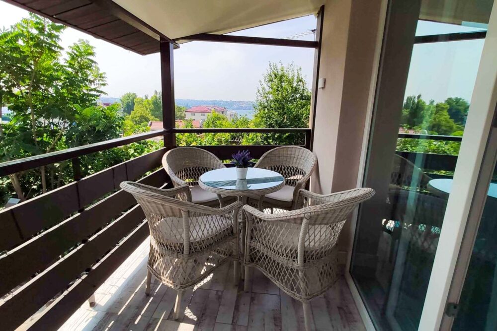 Очень красивый и стильный номер со всеми удобствами. Номер подойдет как для семьи из 3-4 человек, так и для подруг (друзей), т.к. при желании, все спальные места могут быть раздельными. К номеру примыкает комфортный балкон, на котором расположена садовая мебель для отдыха. С балкона открывается чудесный вид на Севастопольскую бухту, а вечером Вы насладитесь отражением ночных огней Севастополя на морской глади.