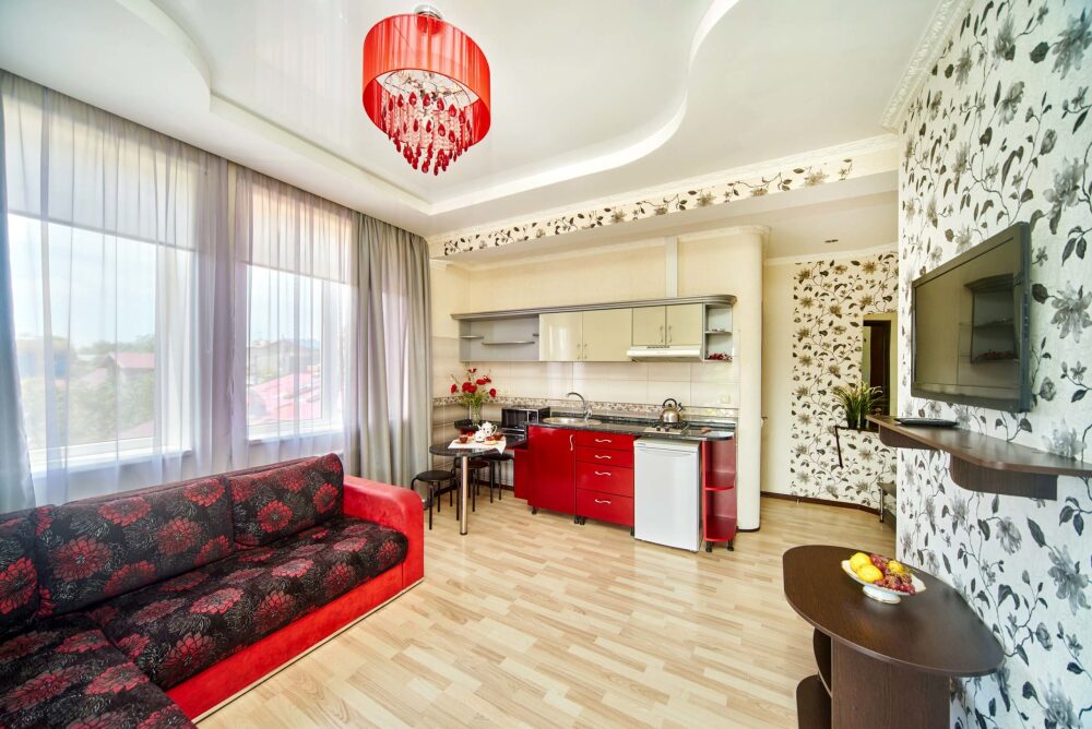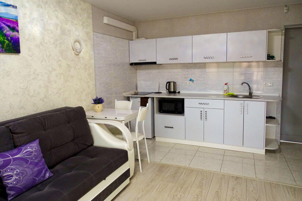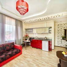 Дизайн-номер с кухней-студио в номере и полноценной возможностью готовить. Выполнен в светлых тонах. Оснащен комфортными спальными местами, платяным шкафом, столом, феном, сейфом, кондиционером, телевизором.