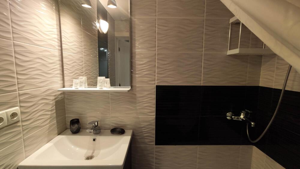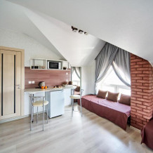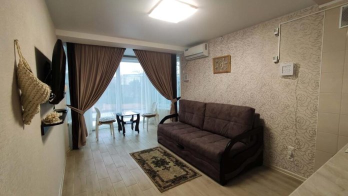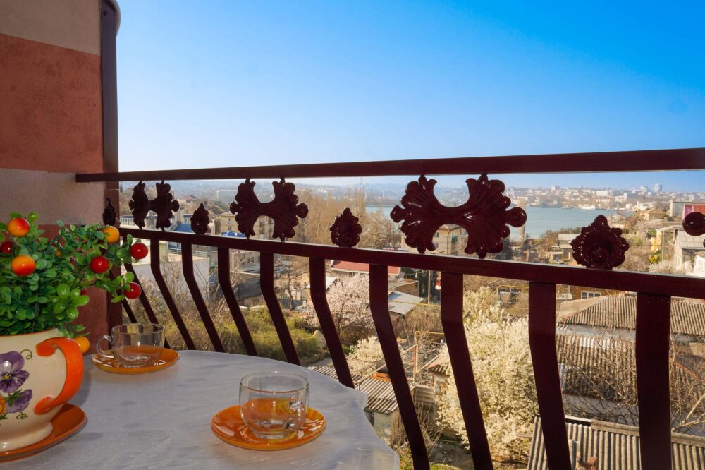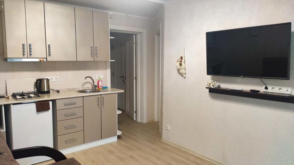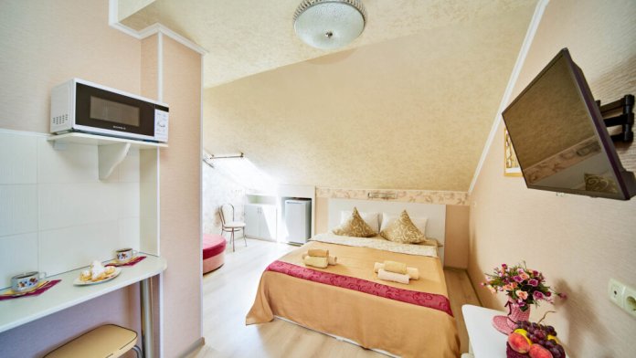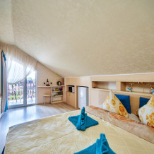 Дизайн-номер выполнен в пастельных тонах, одно из окон расположено в потолке номера, что создаёт необычную стилистику. Зона мини-кухни оборудована холодильником, посудой, СВЧ-печью, эл. чайником. Номер будет удобен для отдыха 2-3 человек. С балкона открывается чудесный вид на море (Севастопольская бухта), а вечером на огни ночного Севастополя. Вам будет уютно и комфортно.