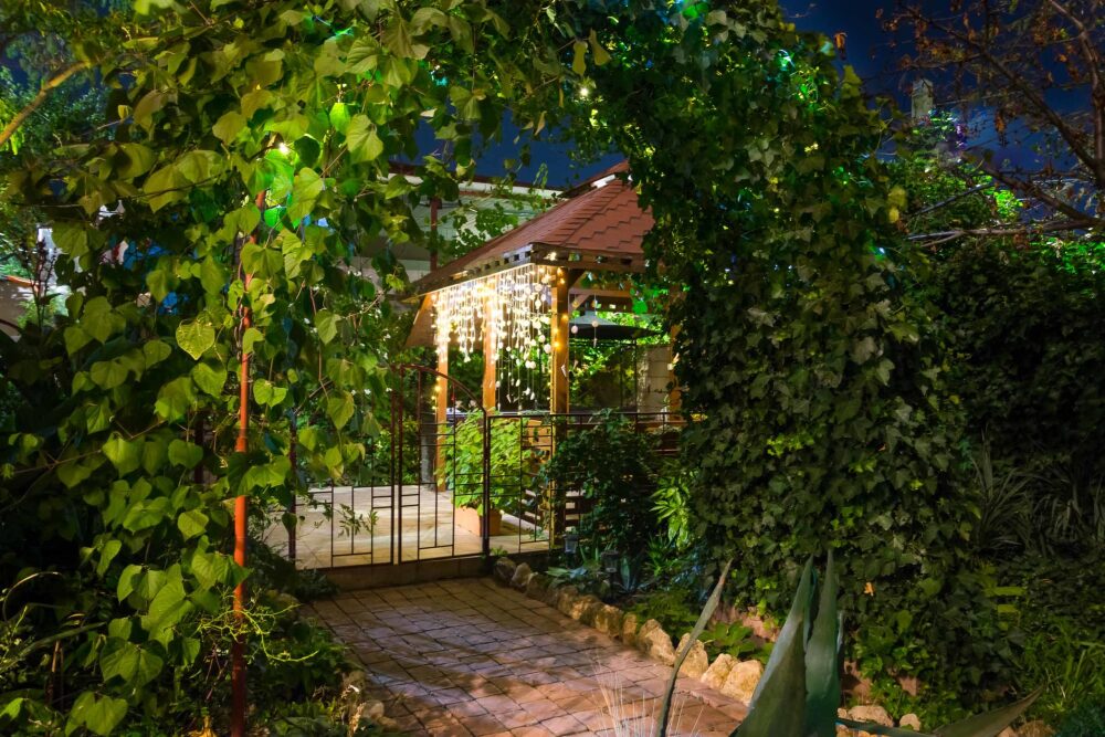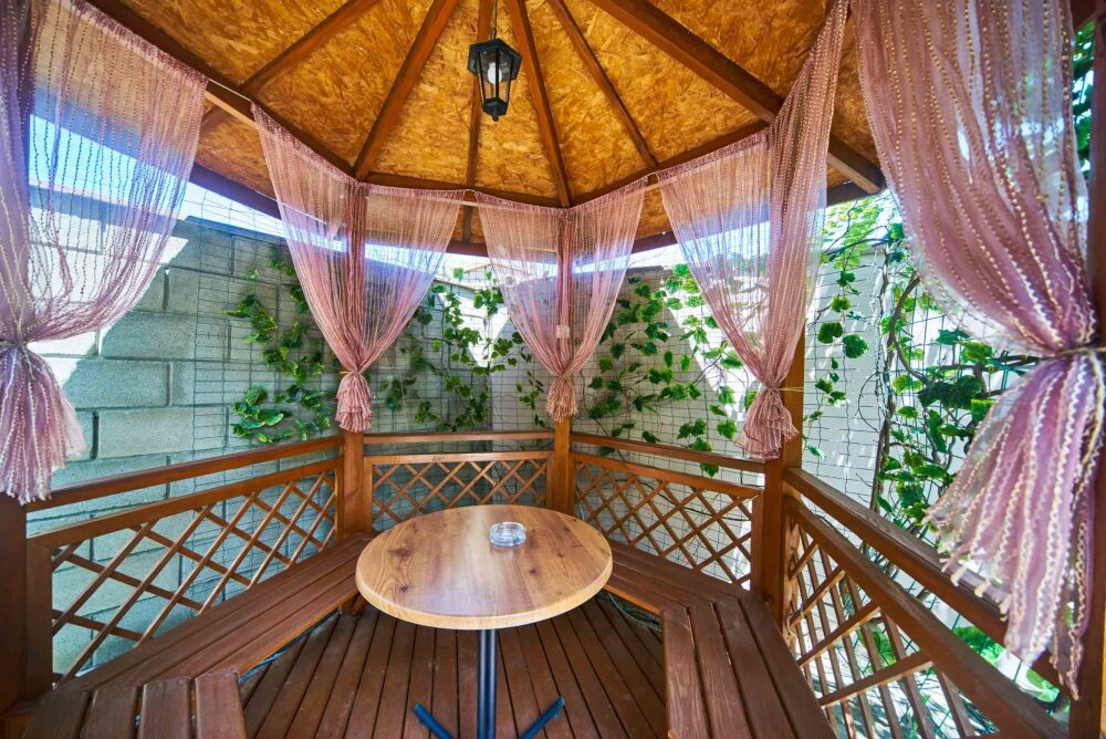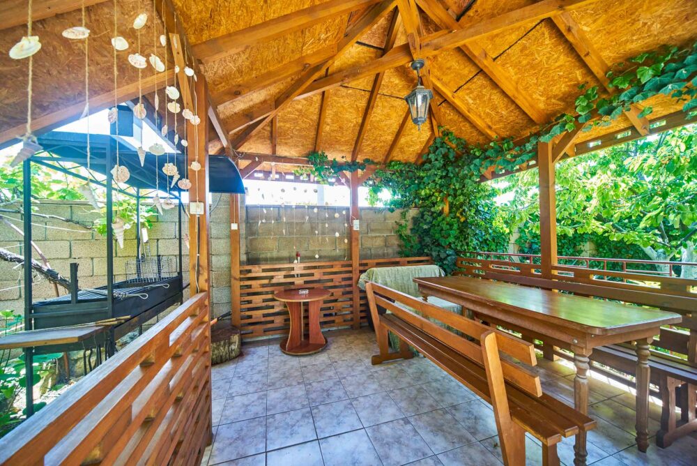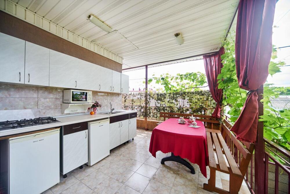 Природный номер на 1 этаже с летней полноценной кухней (индивидуальные посуда, холодильник, столовые приборы, полочки для продуктов) и террасой в окружении виноградной лозы.