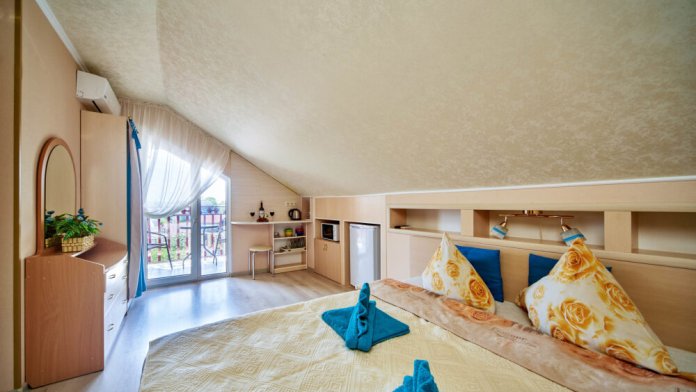 Номер уникален возможностью проводить максимальное количество времени на свежем воздухе и будет комфортен для пары (пары с ребенком до 510 см.) либо для 2-3 друзей.