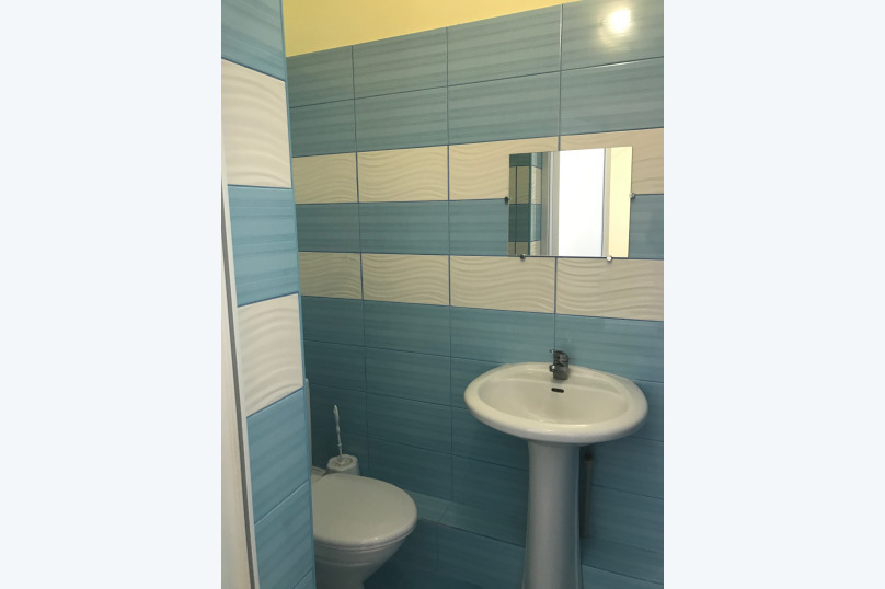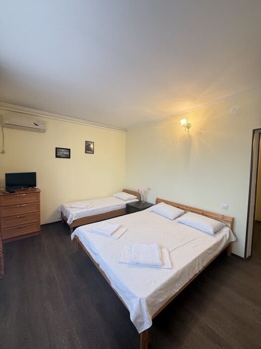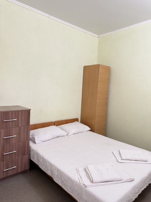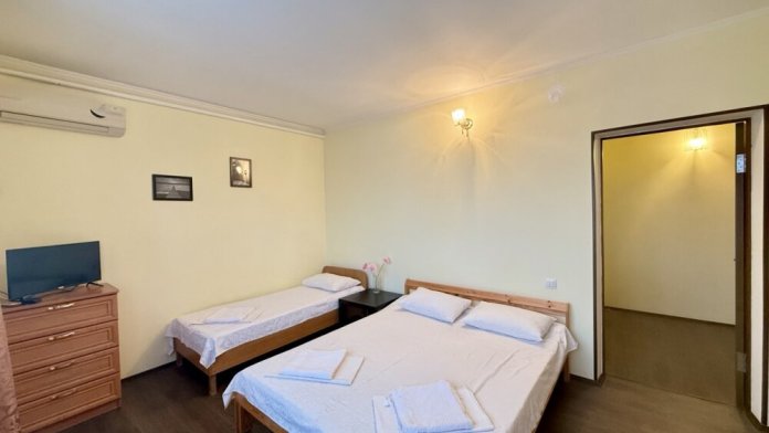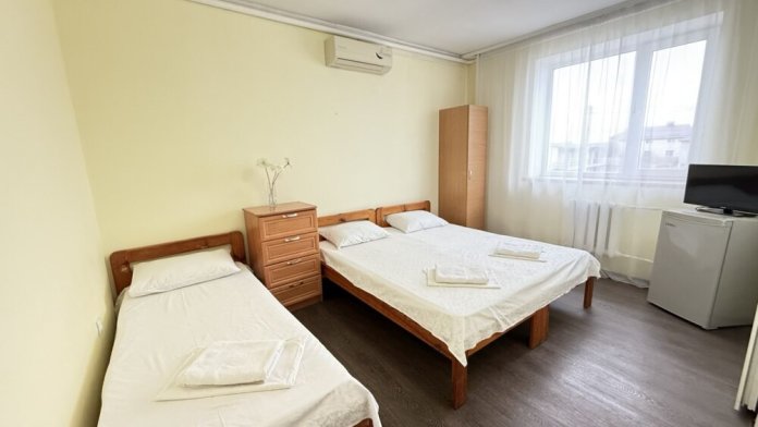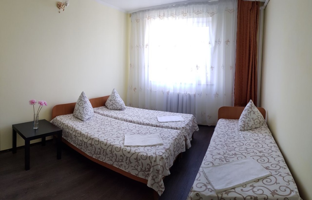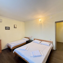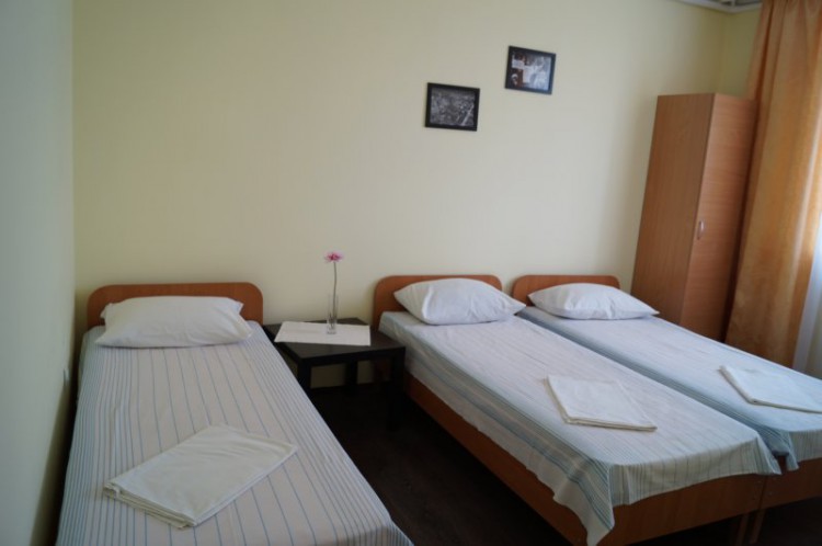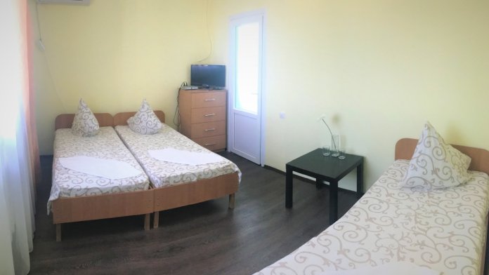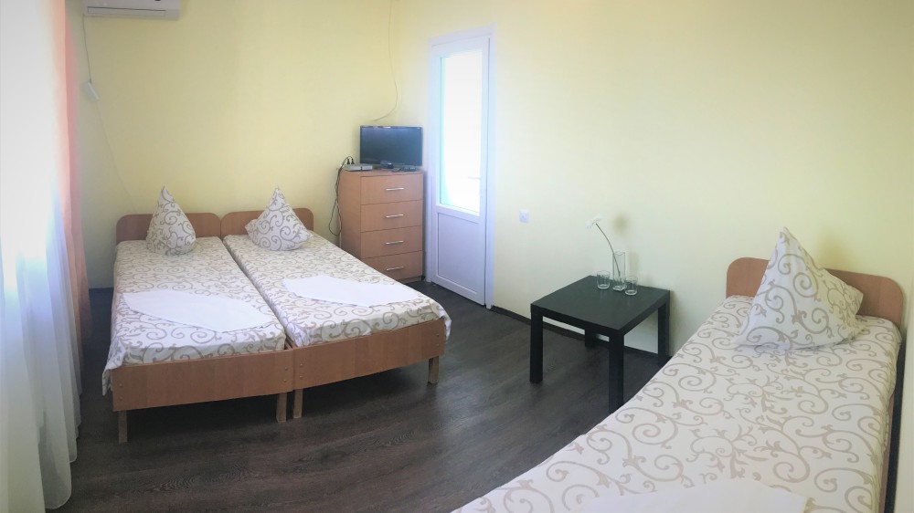 В номере три односпальные кровати прикроватная тумбочка, стул, шкаф, кондиционер, телевизор . Санузел - душевая кабина, туалет, умывальник. Все номера без балкона, вид на поселок или внутренний двор. Площадь номера 14-16 кв. м.