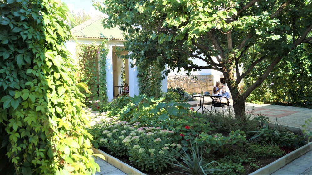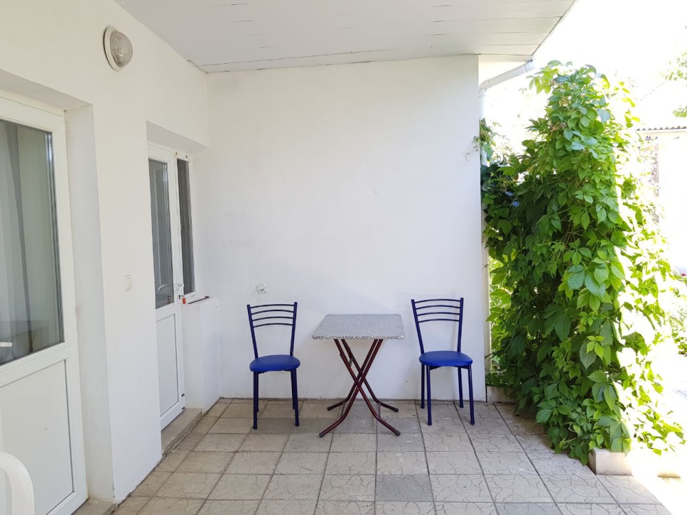 Номер с отдельным входом и собственной террасой. В номере: две односпальные кровати (или одна двуспальная), прикроватная тумбочка, стол, 2 стула, холодильник . Санузел- душевая кабина, туалет, умывальник, зеркало. Выход на внутренний двор. Площадь номера 10 кв.м