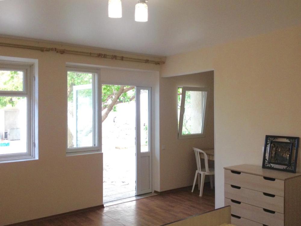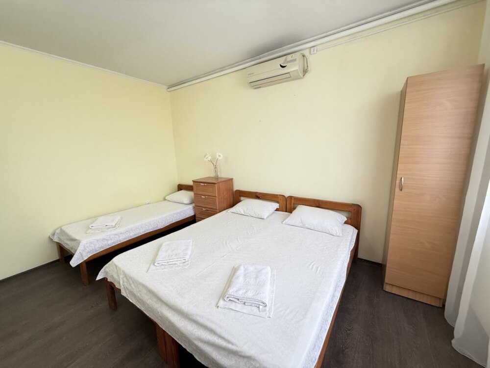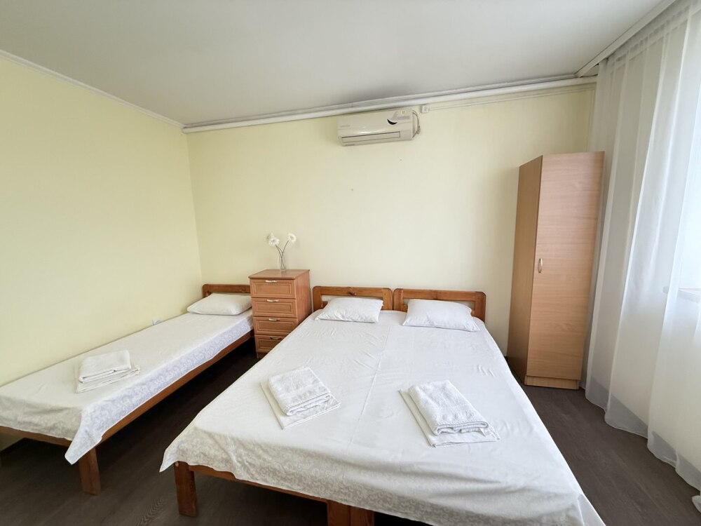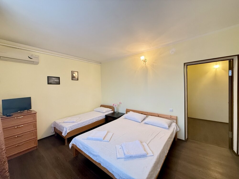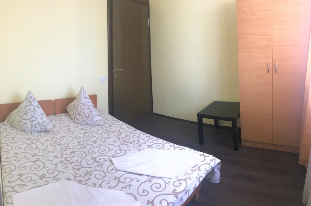 Дом 100 кв.м включают в себя : две спальни, кухню, ванна , душевая кабина , туалет, стиральную машину, ТВ, кондиционер.В номерах односпальные и двуспальные кровати, прикроватные тумбочки, стулья, шкаф, кондиционер, телевизор. Площадь апартаментов 100 кв.м . Общий двор с другими отдыхающими.