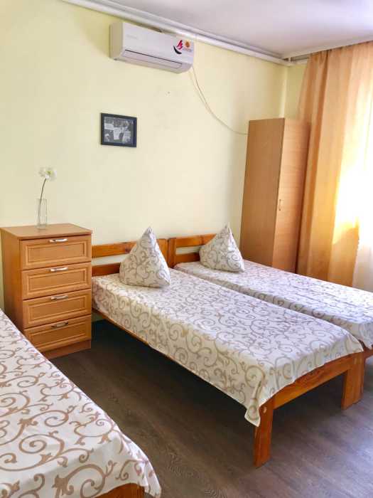 Номер с отдельным входом и собственной террасой. В номере: три односпальные кровати , прикроватная тумбочка, шкаф, стол, 2 стула, холодильник . Санузел- душевая кабина, туалет, умывальник, зеркало. Выход на внутренний двор. Площадь номера 12 кв.м
