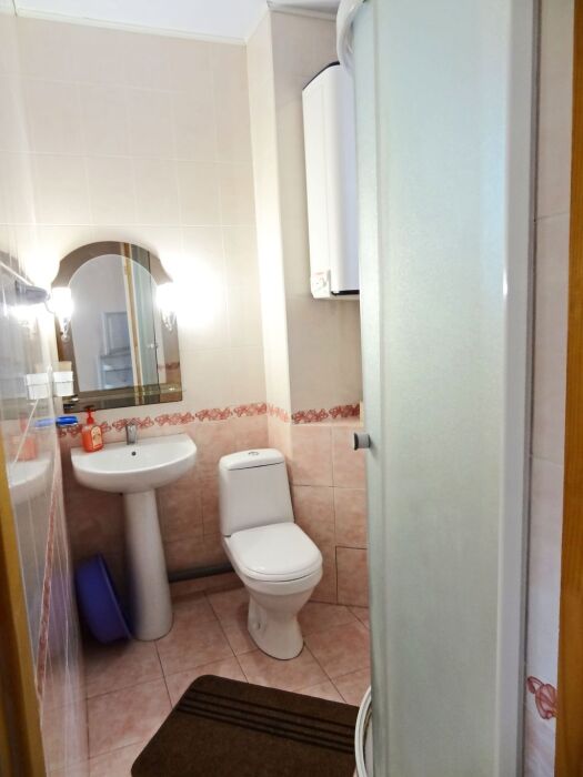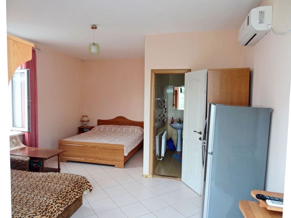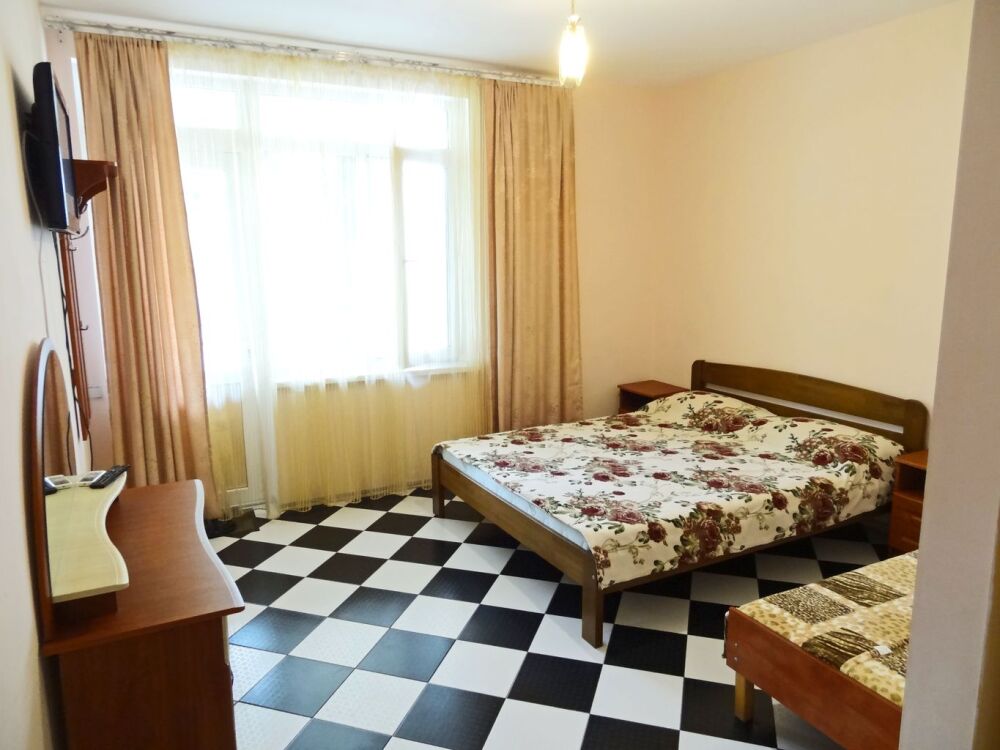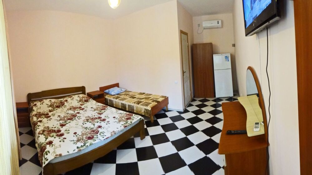 В номере: двуспальная кровать, односпальная кровать, шкаф, трюмо, телевизор (кабельное), холодильник, кондиционер, санузел (совмещенный), душ, холодная-горячая вода. Есть возможность установить доп место - раскладушка с матрасом.