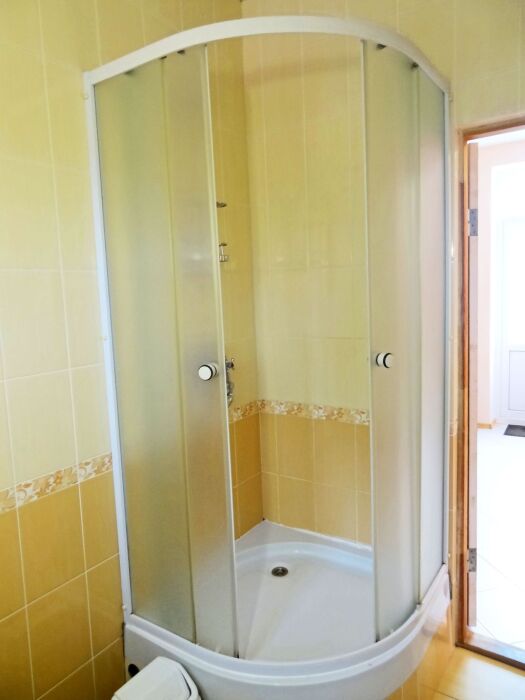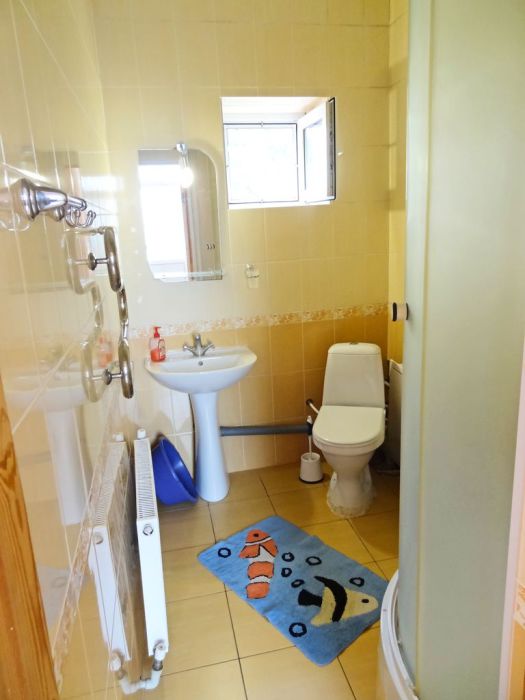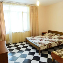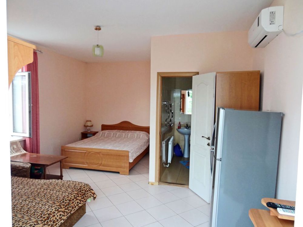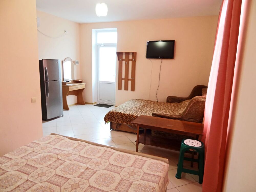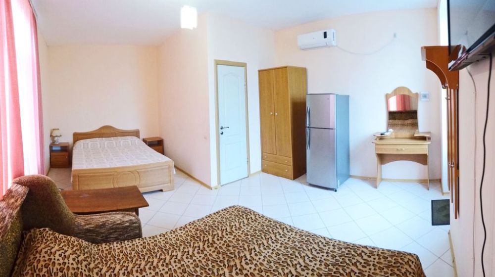 Номер находится в отдельном домике, на 2 этаже. В номере: двуспальная кровать, двухспальная софа (раскладывается), 3 тумбочки, шкаф, трюмо, телевизор (кабельное), холодильник, кондиционер, санузел (совмещенный), душевая кабина, холодная-горячая вода.