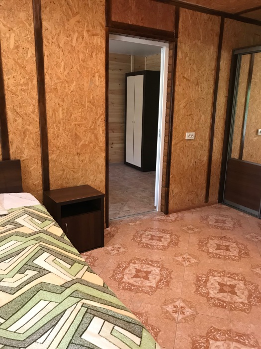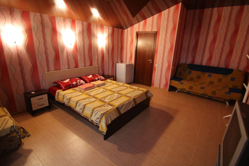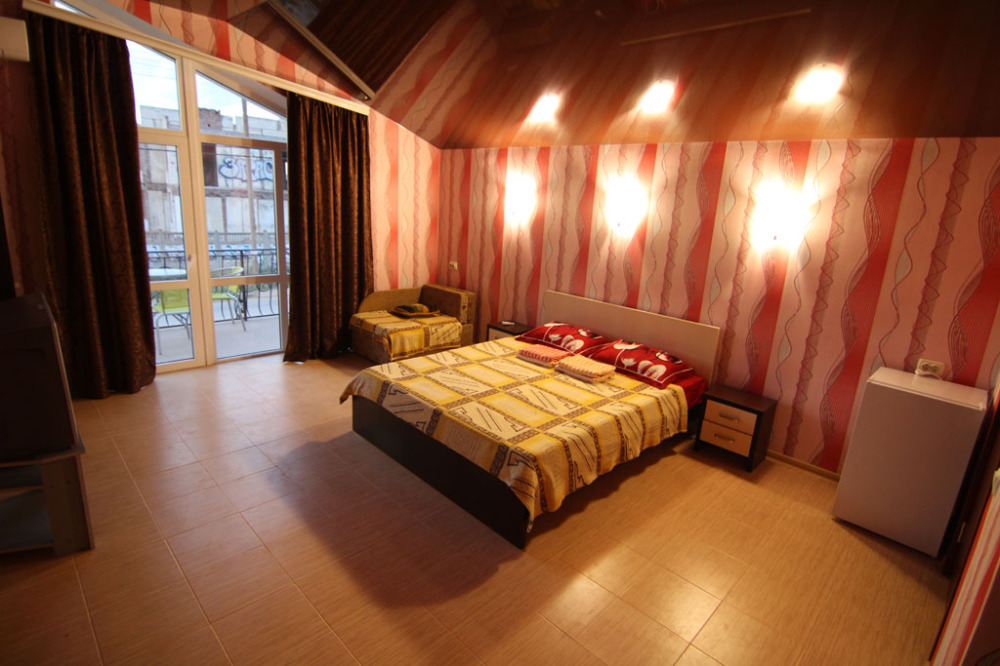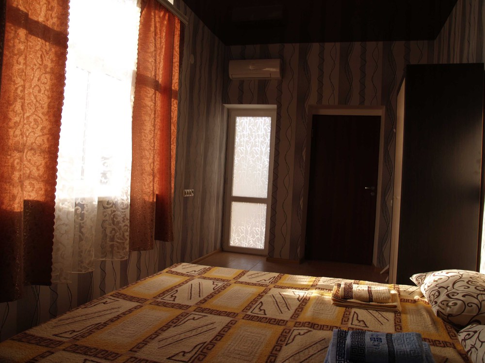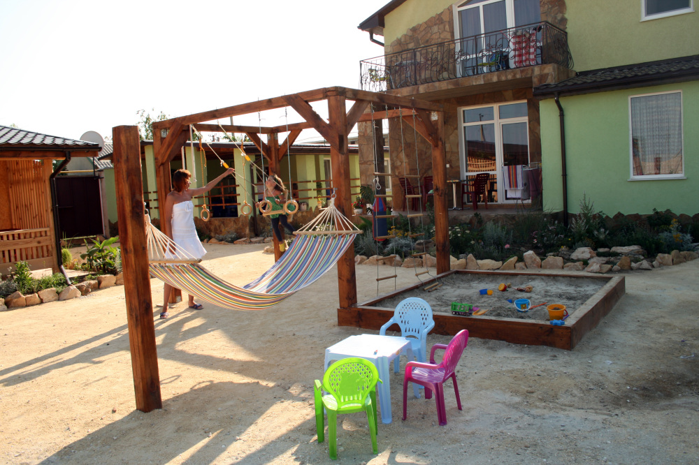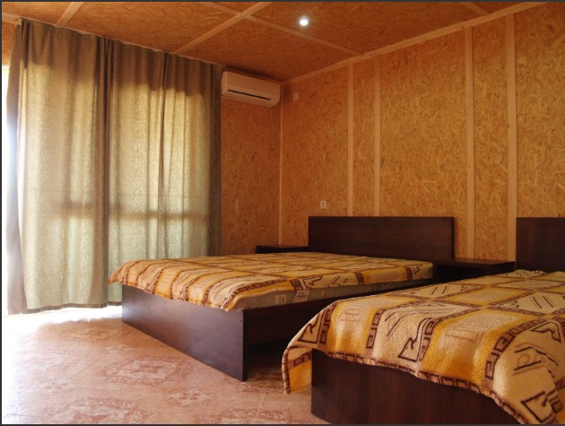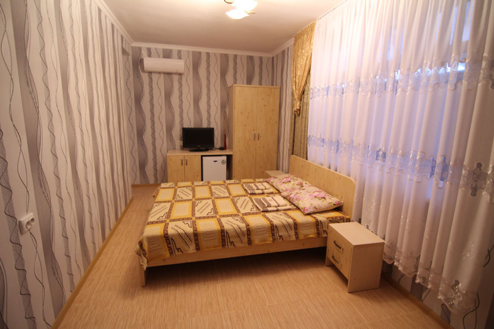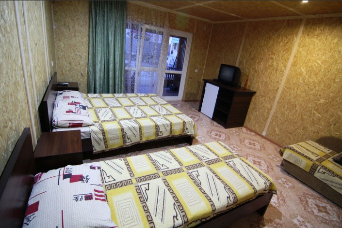 Предоставляем в аренду комфортабельные номера, вместимостью от 2-х до 5-ти человек, с новым современным ремонтом. В номерах все удобства (индивидуальный санузел, постоянно горячая и холодная вода). В каждом номере есть кондиционер, холодильник и телевизор. Wi-Fi. Выход на террасу. На территории есть кухня, беседки, скамейки и мангал. Есть возможность заказать питание. Детская площадка оборудована спортивным инвентарем для детей разного возраста. Есть батут.