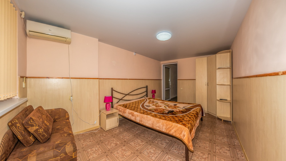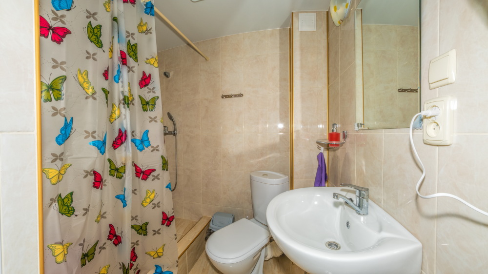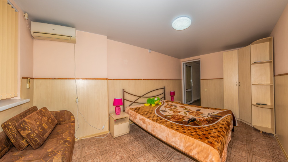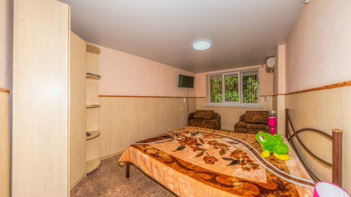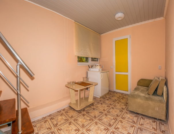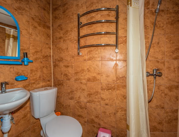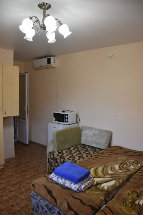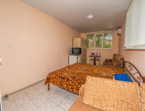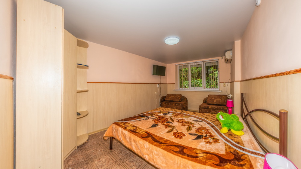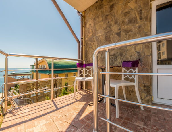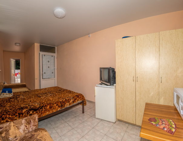 В каждом номере вентилятор, цифровое ТВ, Wi-Fi, две односпальные кровати, прикроватные тумбочки, платяной шкаф, электрический чайник, холодильник, необходимый набор посуды, обеденный стол и стулья. Санузел (душ и туалет) у данной категории номеров общий на три номера. Общая кухня не предусмотрена. К Вашим услугам общий балкон на три номера с видом на море. При заселении конфигурация номера может незначительно отличаться (в зависимости от наличия свободного номера).
