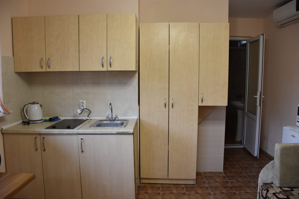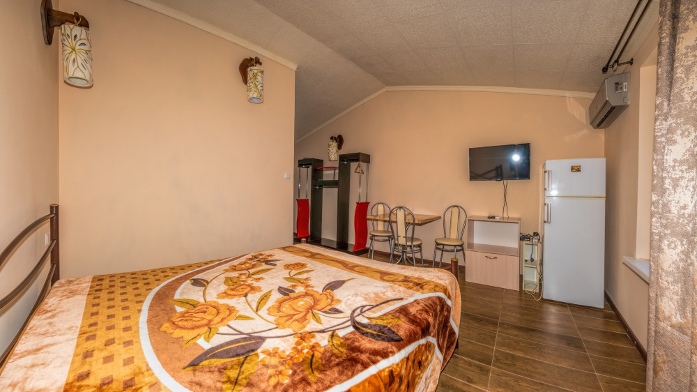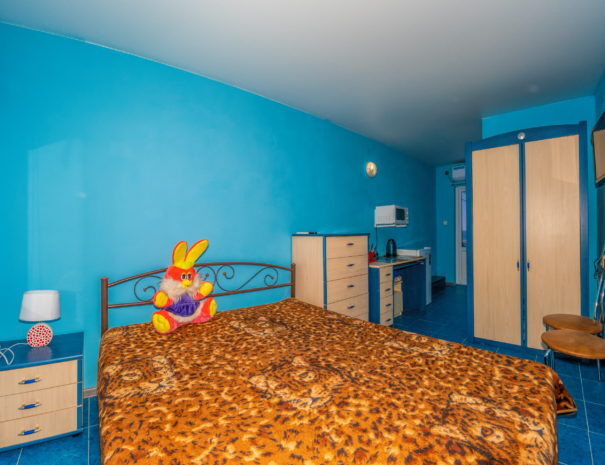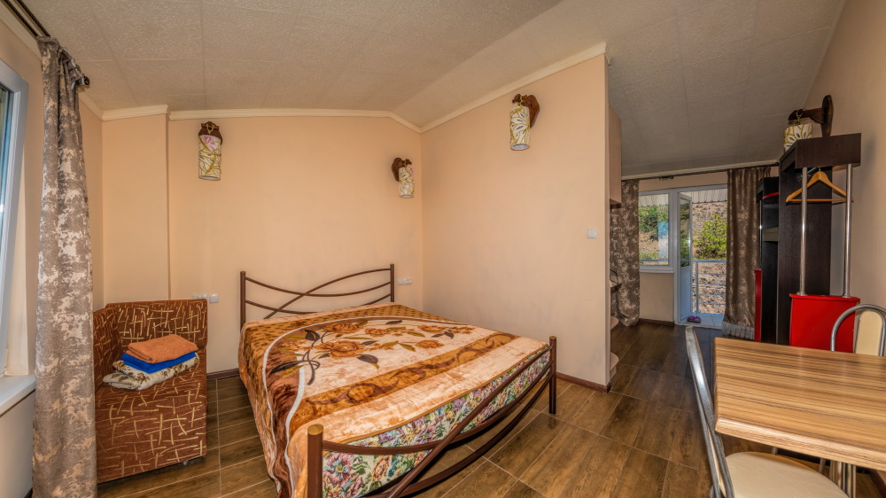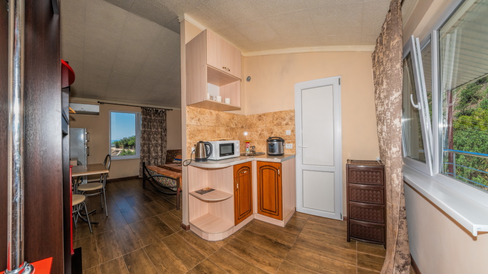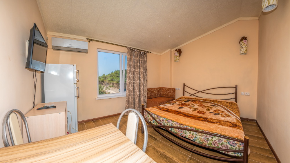 В каждом номере спальная комната, совмещенная с обеденной зоной, и санузел (душ и туалет). Спальная комната оснащена цифровым ТВ, Wi-Fi, кондиционером, двуспальной кроватью либо двуспальным диваном, диваном-малюткой, прикроватными тумбочками и стенкой для одежды. Обеденная зона – мультиваркой, микроволновой печью, электрическим чайником, холодильником, кухонной мебелью с необходимым набором посуды, обеденным столом и стульями. Из окон открывается прекрасный вид на море. При заселении конфигурация номера может незначительно отличаться (в зависимости от наличия свободного номера).