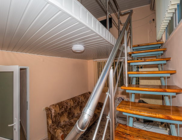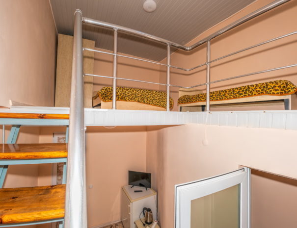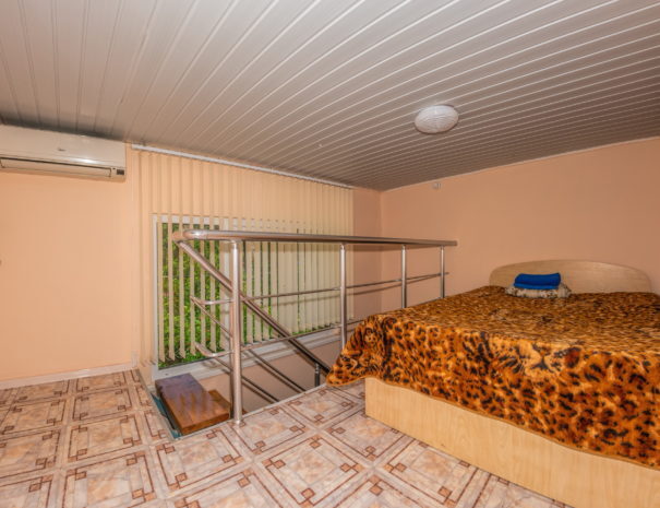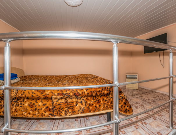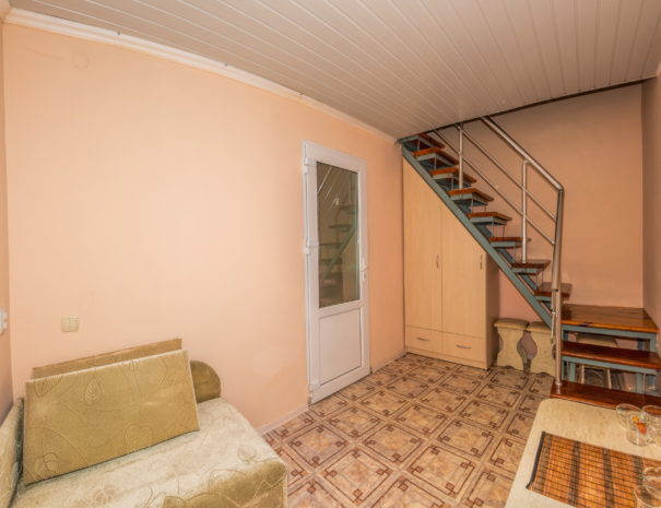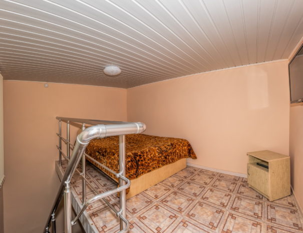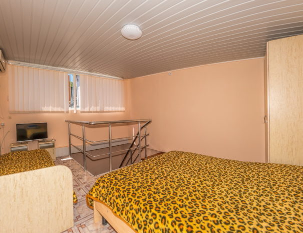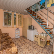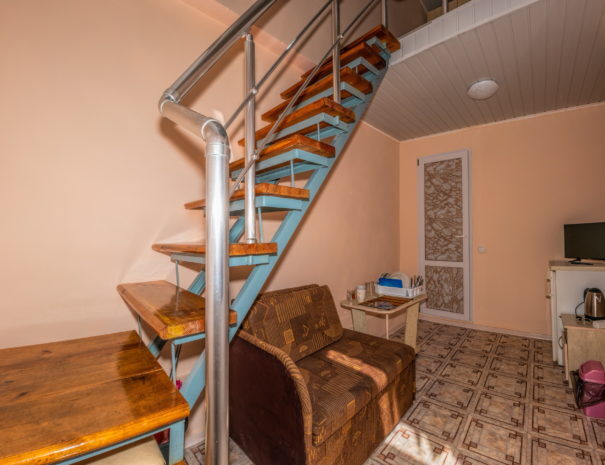 На первом этаже гостиная комната, совмещенная с обеденной зоной, и личный санузел (душ и туалет); на втором этаже спальная комната с кондиционером, Wi-Fi, двуспальной либо тремя односпальными кроватями и прикроватными тумбочками. В гостиной комнате – цифровое ТВ, двуспальный либо односпальный раскладной диван, платяной шкаф, электрический чайник, необходимый набор посуды, холодильник, обеденный стол и табуретки. Общая кухня на три номера. При заселении конфигурация номера может незначительно отличаться (в зависимости от наличия свободного номера).