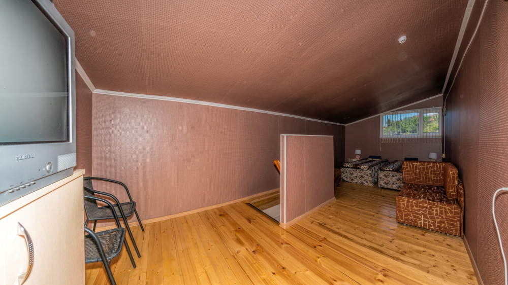 На первом этаже гостиная комната, совмещенная с кухней, и отдельный санузел (душ и туалет); на втором этаже спальная комната с цифровым ТВ, Wi-Fi, кондиционером, двуспальной либо двумя односпальными кроватями, двумя диванами-малютками, прикроватными тумбочками и комодом. В гостиной комнате – раскладной двуспальный диван, варочная панель, электрический чайник, холодильник, микроволновая печь, кухонная мебель со всеми необходимыми кухонными принадлежностями, обеденный стол и стулья. Общий балкон на два номера с видом на горы.
