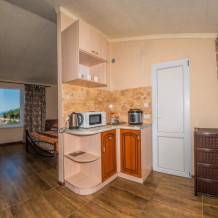 В каждом номере спальная комната, совмещенная с кухней, и санузел (душ и туалет). Спальная комната оснащена цифровым ТВ, Wi-Fi, кондиционером, двуспальной кроватью и диваном-малюткой, прикроватными тумбочками и платяным шкафом. Совмещенная со спальней кухня – электрической плитой, микроволновой печью, электрическим чайником, холодильником, кухонной мебелью, необходимым набором посуды, обеденным столиком и стульями. При заселении конфигурация номера может незначительно отличаться (в зависимости от наличия свободного номера).