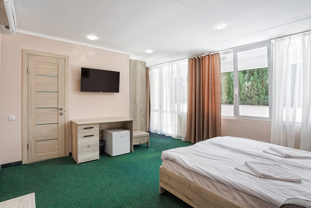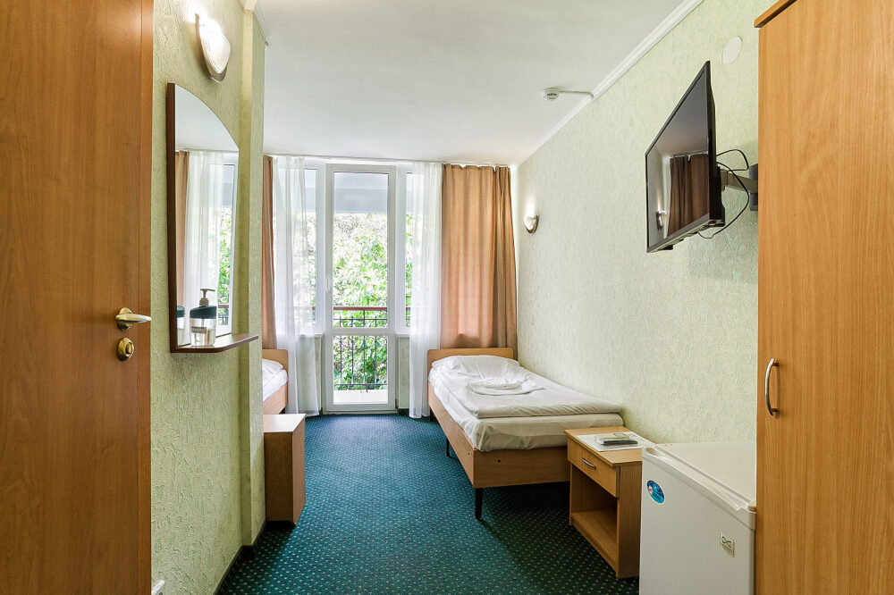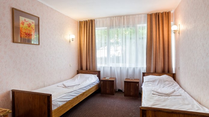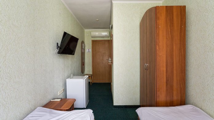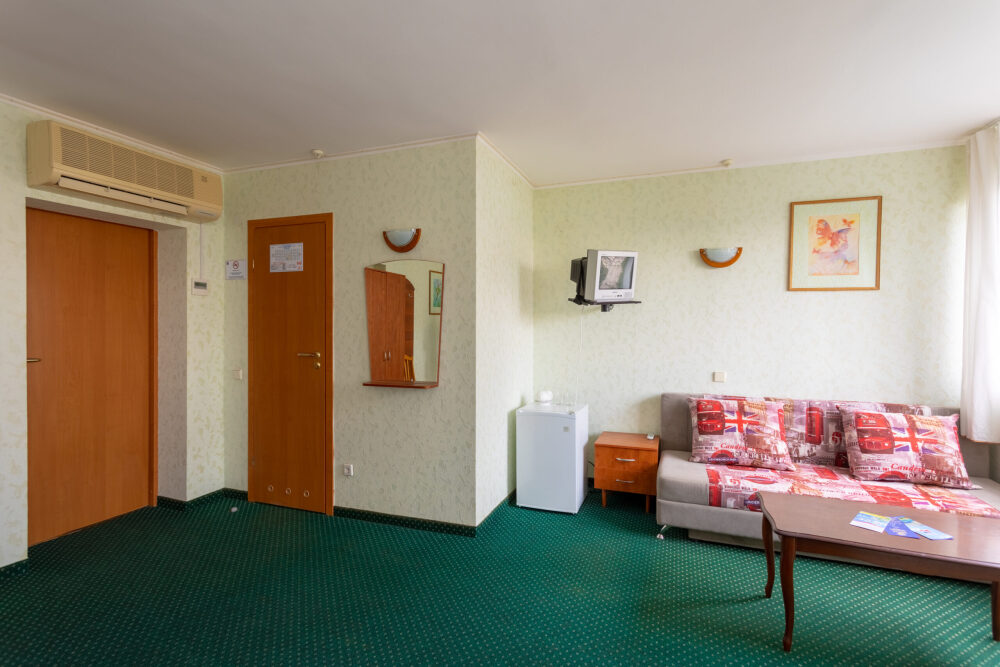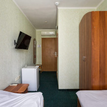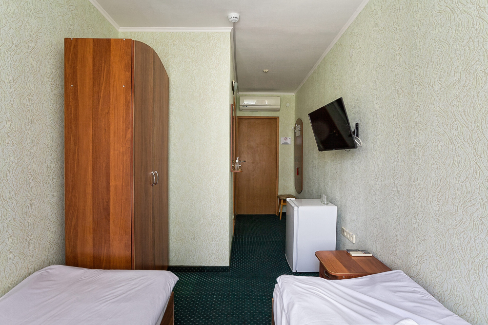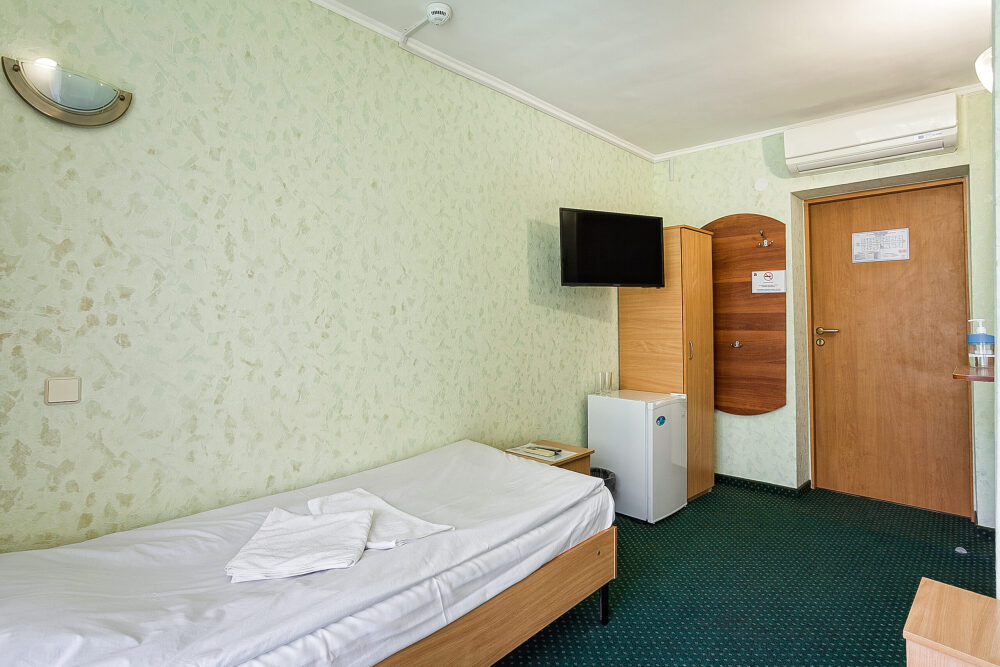 1-комнатный 2-местный номер категории «Стандарт В Плюс» с возможность дополнительного места на раскладушке (окна выходят на северную сторону) оснащен: всеми удобствами (туалет, умывальник, душ), кондиционер, телевизор, холодильник, набор современной мебели, без балкона.