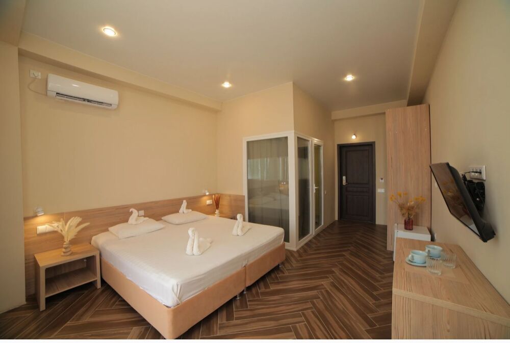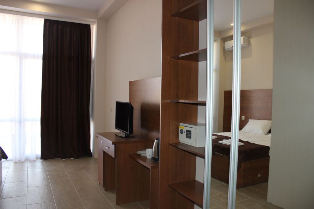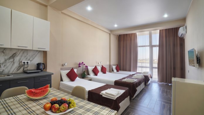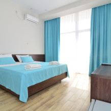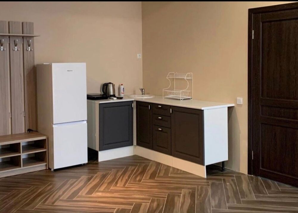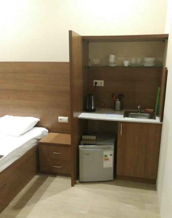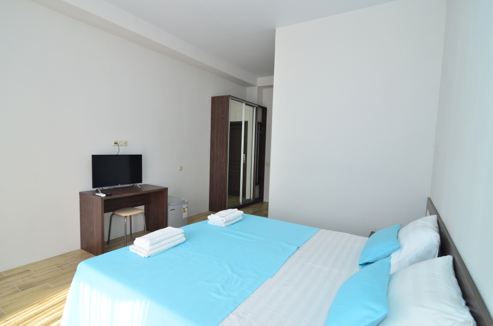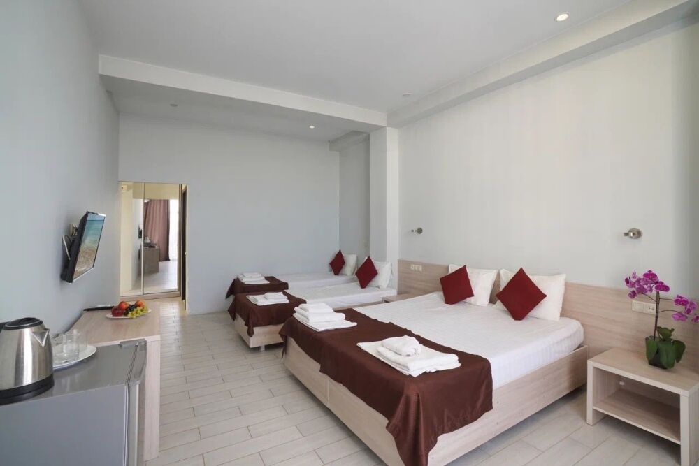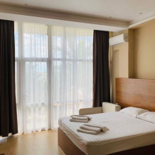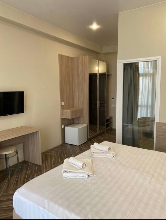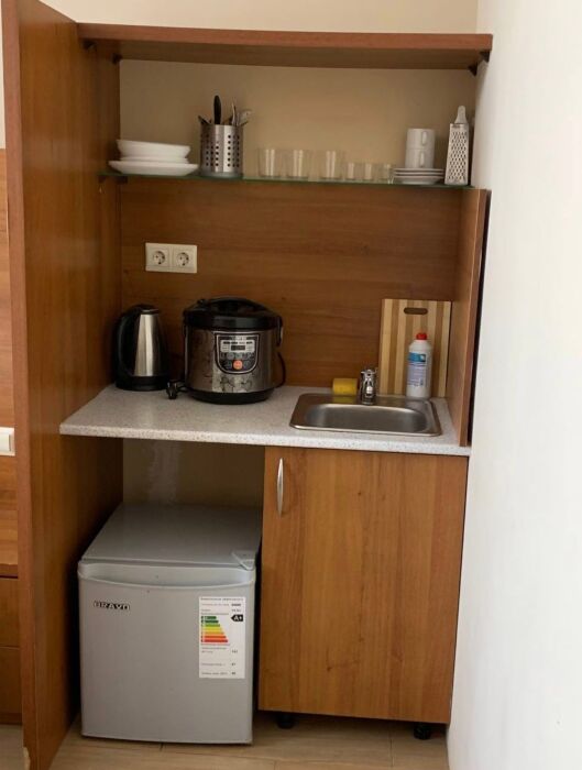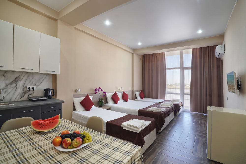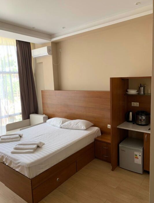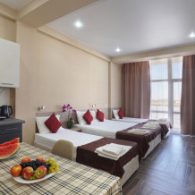 Семейный номер с кухней и балконом. Состоит из спальни (двухспальная кровать и балкон, санузел) и гостинной, где есть обеденная зона и диван раскладной на 2 человек. Также этот номер есть на 1 этаже, там свой дворик, вместо балкона. На кухне индукционная плита одноконфорочная, чайник, набор посуды.