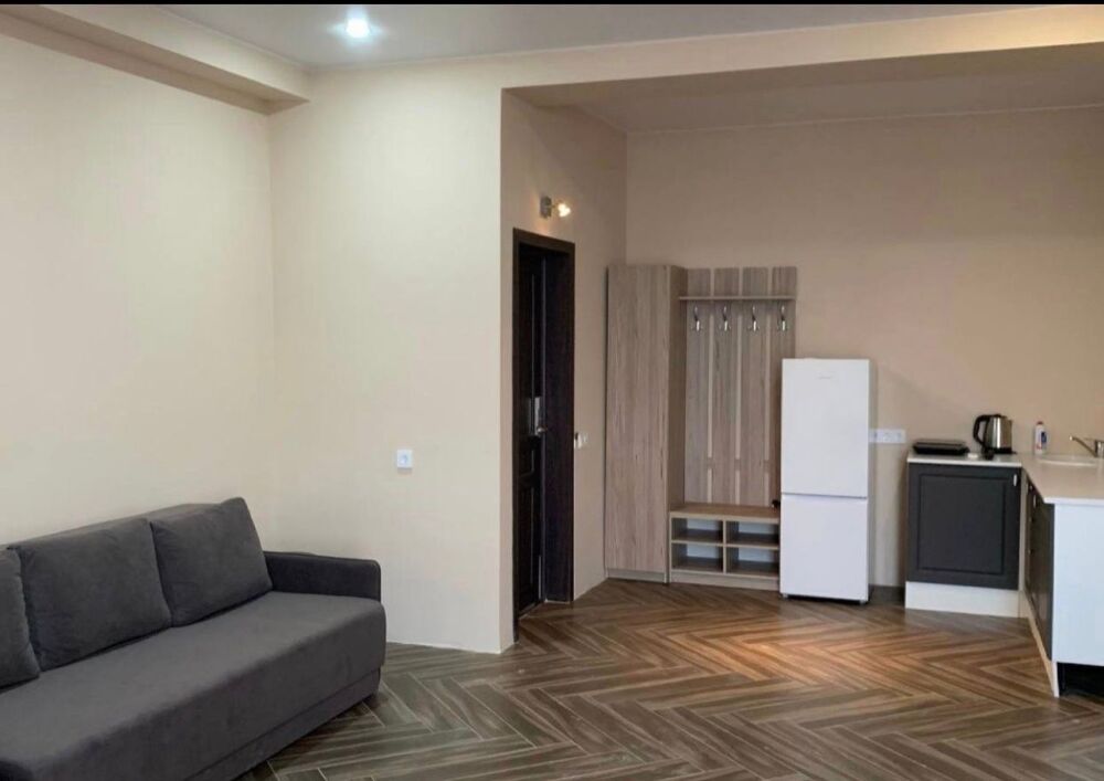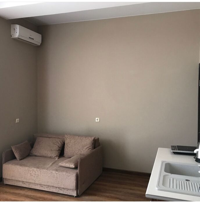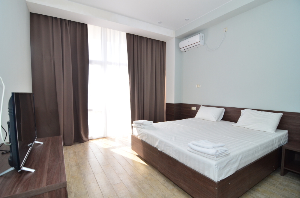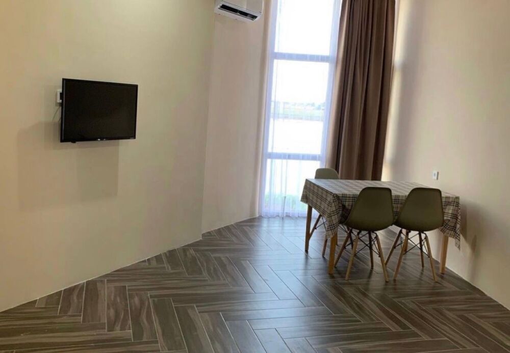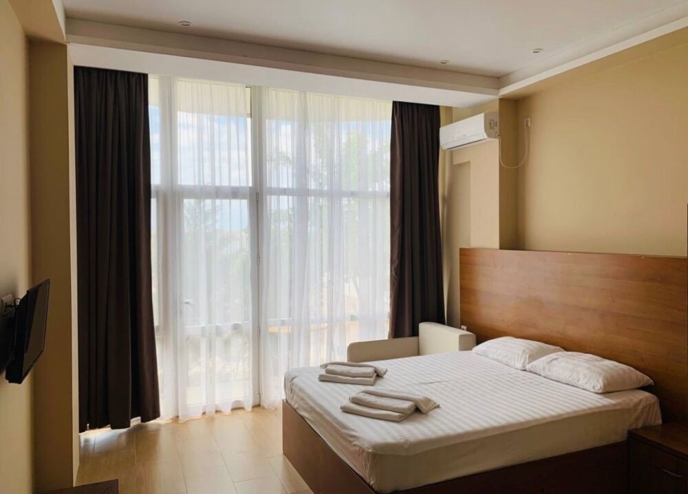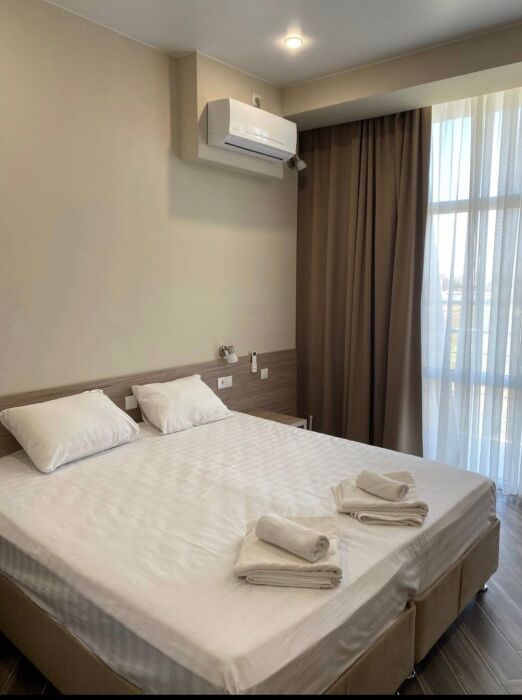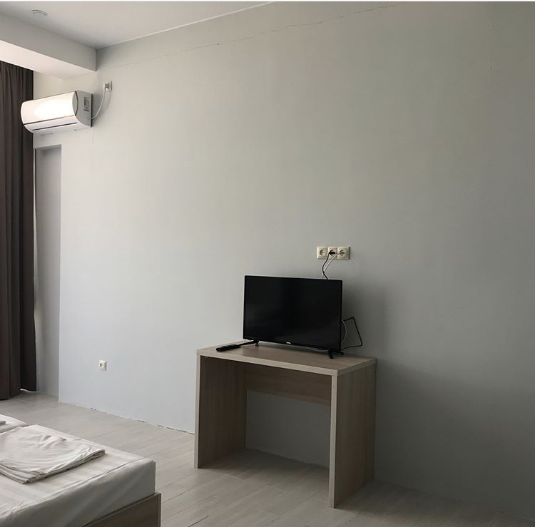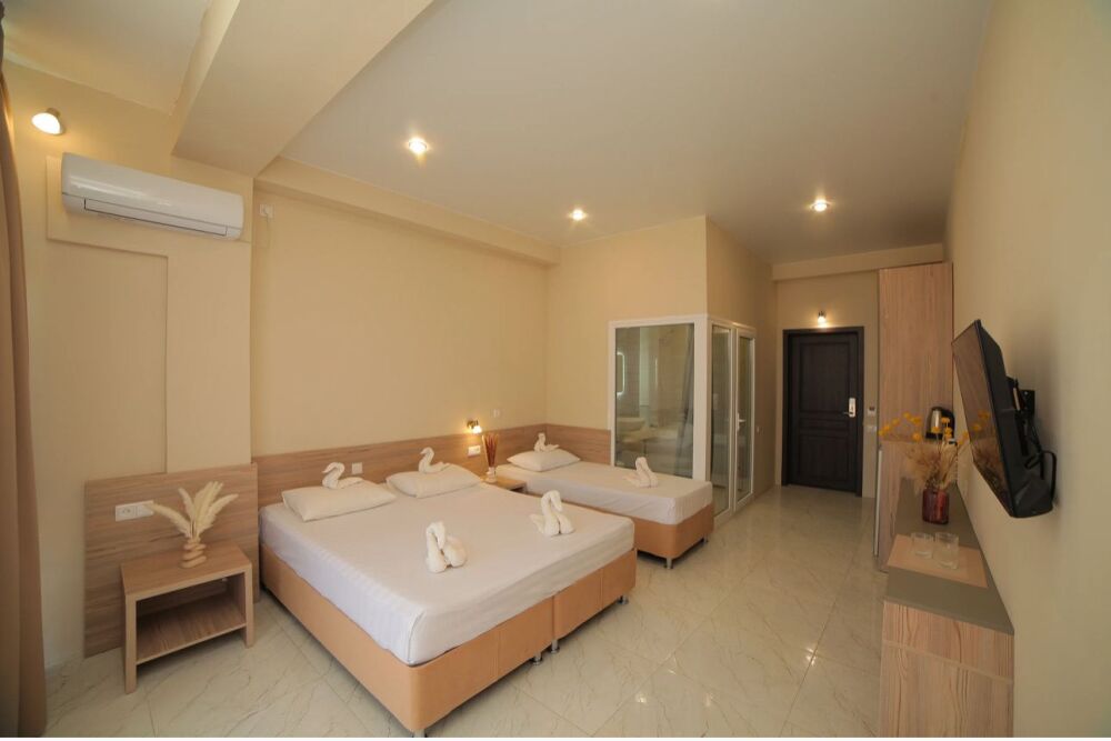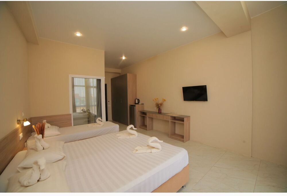 Семейный номер с кухней и балконом. Состоит из спальни (двухспальная кровать и балкон, санузел) и гостинной, где есть обеденная зона и диван раскладной на 2 человек. Также этот номер есть на 1 этаже, там свой дворик, вместо балкона. На кухне индукционная плита одноконфорочная, чайник, набор посуды.