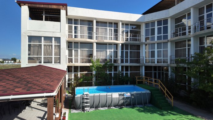 Гостевой дом «Leo Grand» расположен в 2 минутах ходьбы от широкого песчаного пляжа, 150 м. В шаговой доступности магазины, аптека, рынок, центр развлечений, остановка общественного транспорта. Ближайший город Евпатория 25 км. и в 3 км ПГТ Мирный. До аквапарка и дельфинария можно добраться за 40 мин.